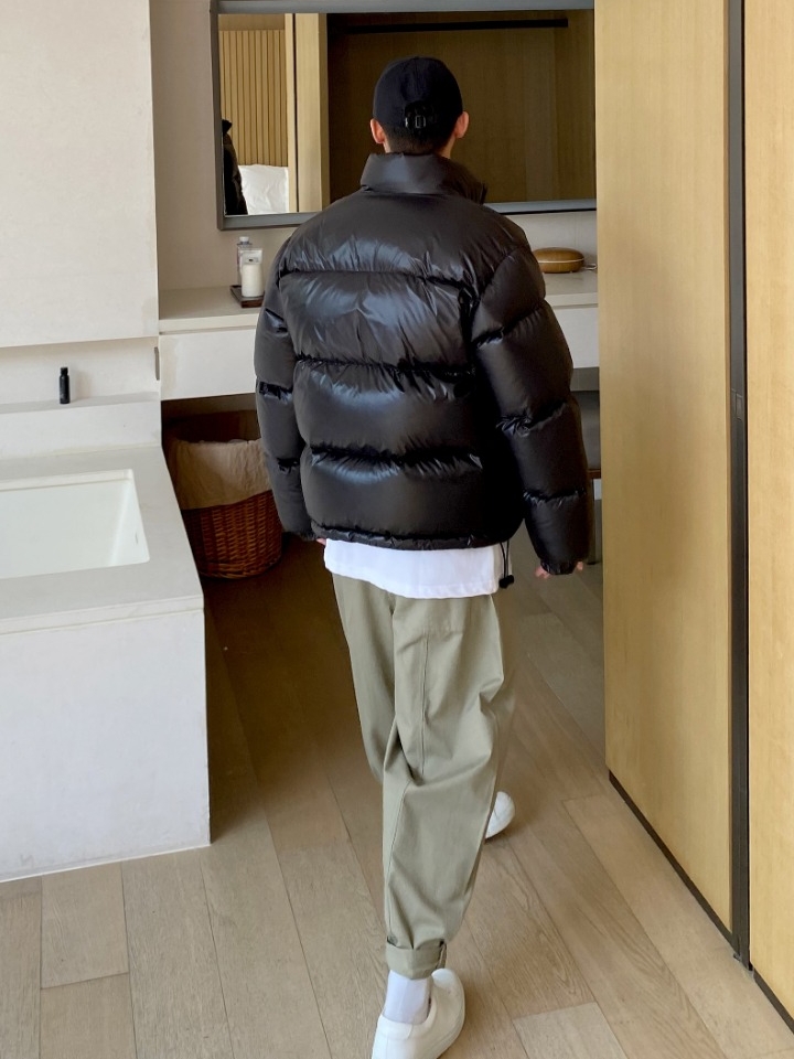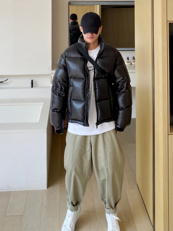 羽绒服上面的绗线让黑色不显单调感,日常内搭白色T恤,下搭一条卡其色工装裤和白色板鞋,显得荷尔蒙爆棚,超级的有型。