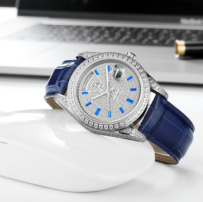 采用的是人工合成蓝宝石的镜面材质,具有不错的防刮耐磨性能。真皮的表带材质,佩戴舒适透气。