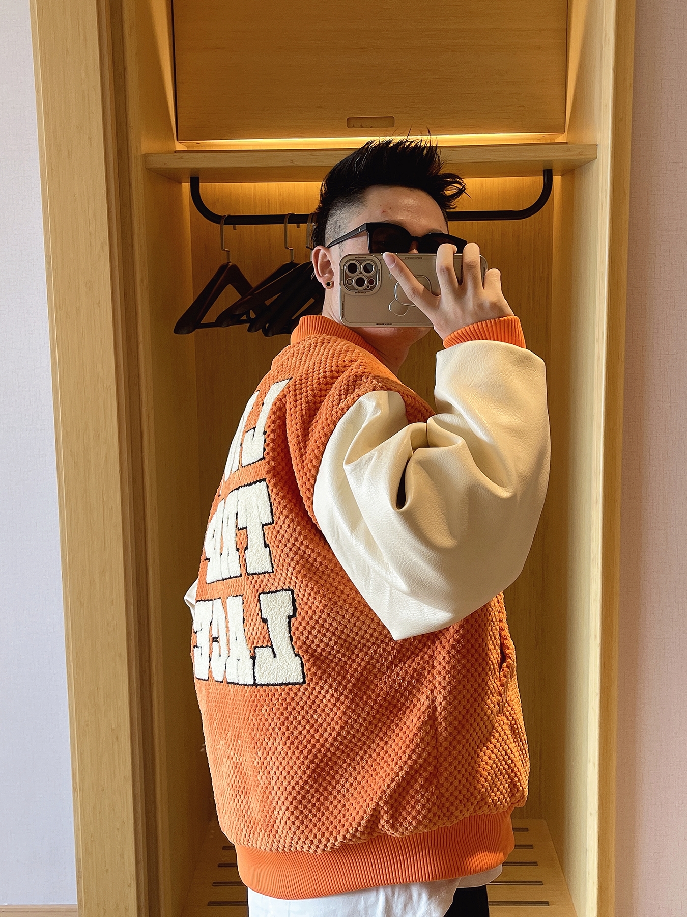 橘色超级的好看,后背的字母装饰也有满满的时尚感,带花纹的面料,有质感的同时,还丰富了整体的层次感。