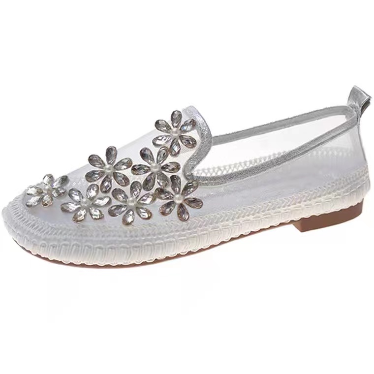 水钻的装饰,让鞋子看起来更加的闪亮,而且平底的设计,穿起来很舒适,很适合夏天穿。