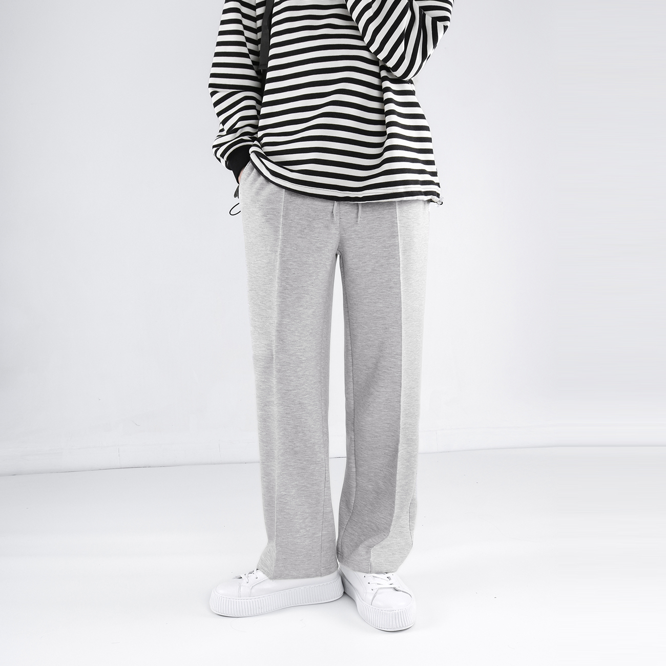 宽松裤型,穿着舒适自在,直筒裤型,修饰腿部线条,简约款式,休闲时尚百搭,白色的色调,简约又百搭。