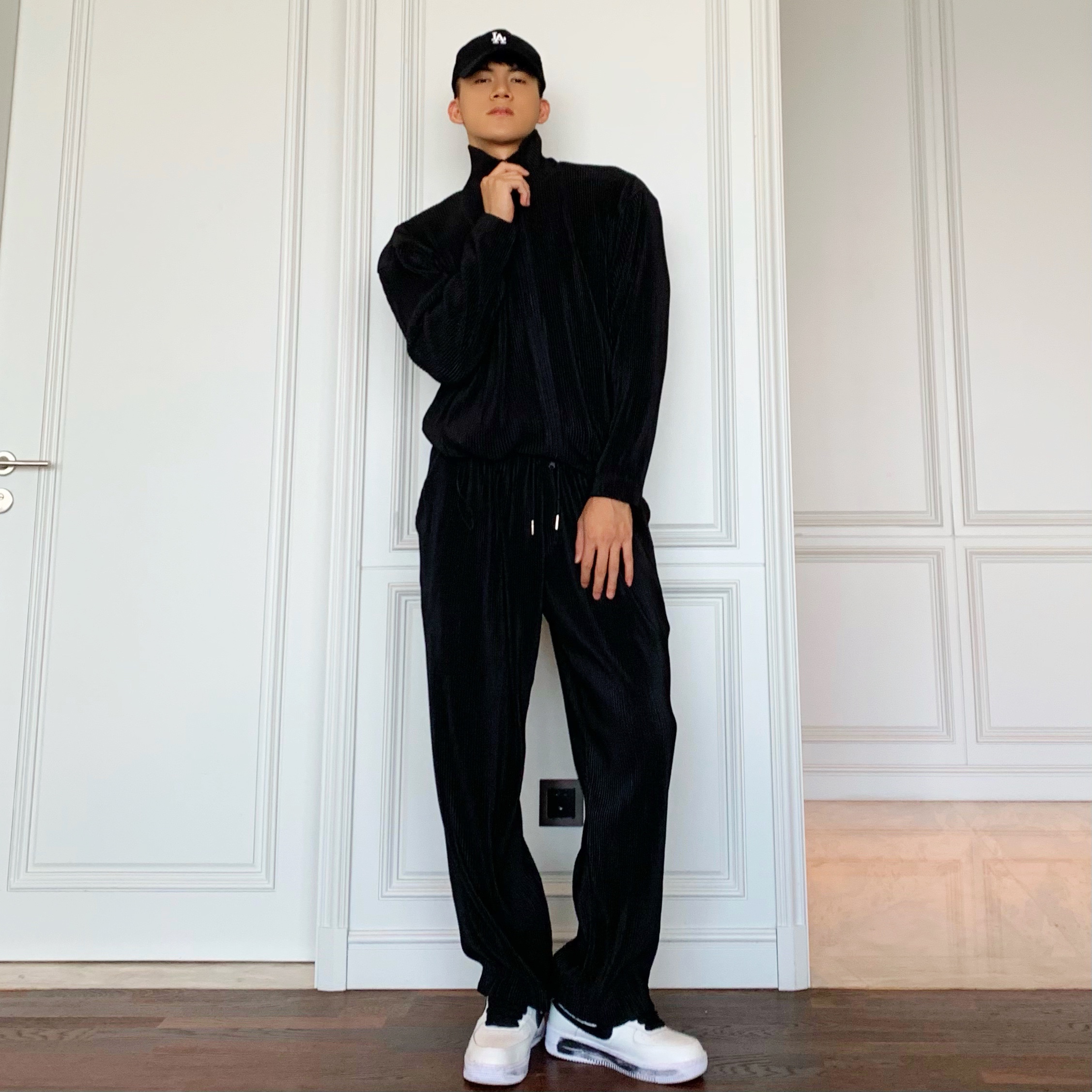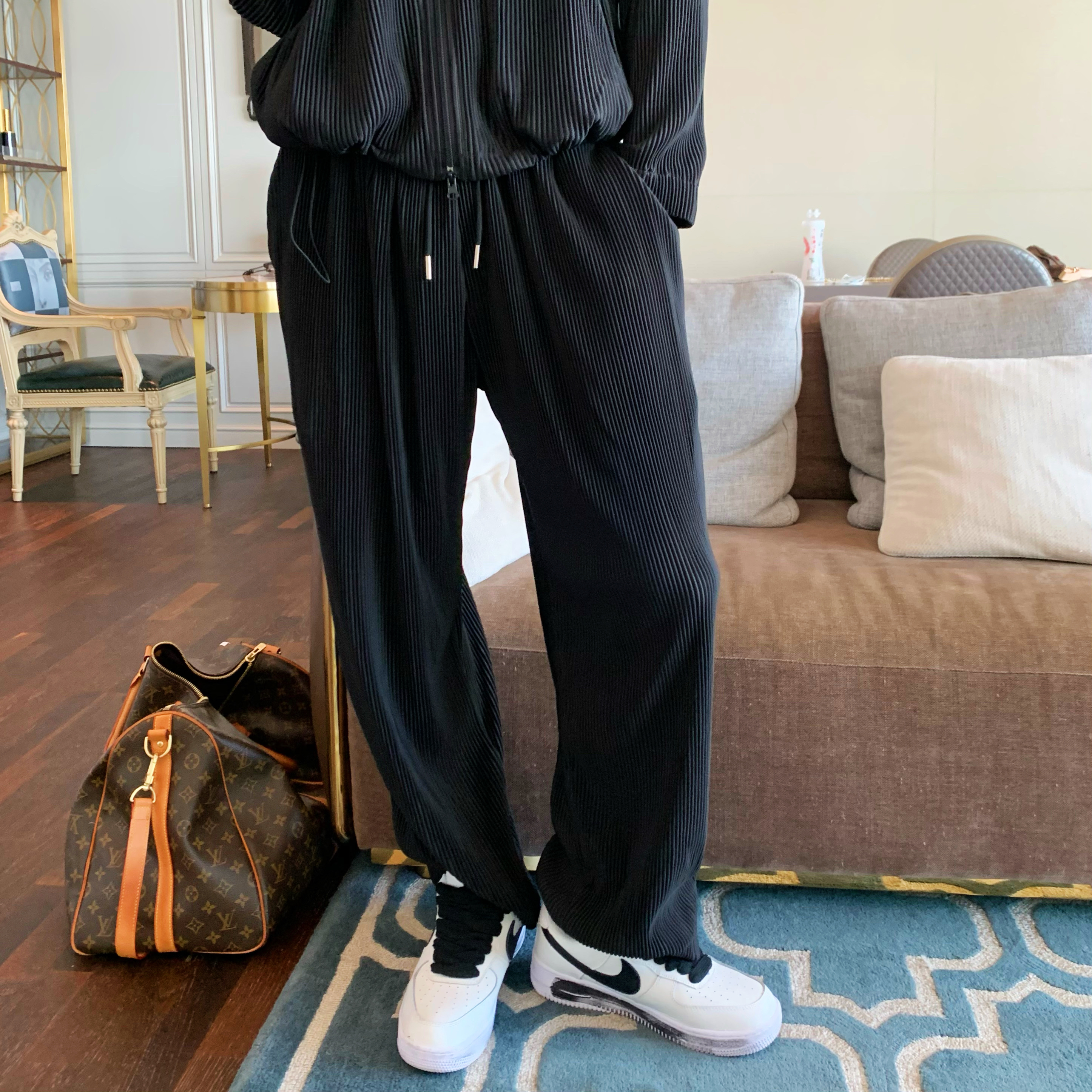 休闲运动风格,时尚百搭,长裤版型,修饰腿部线条,褶皱设计,丰富视觉效果,宽松长裤,穿着舒适自在。