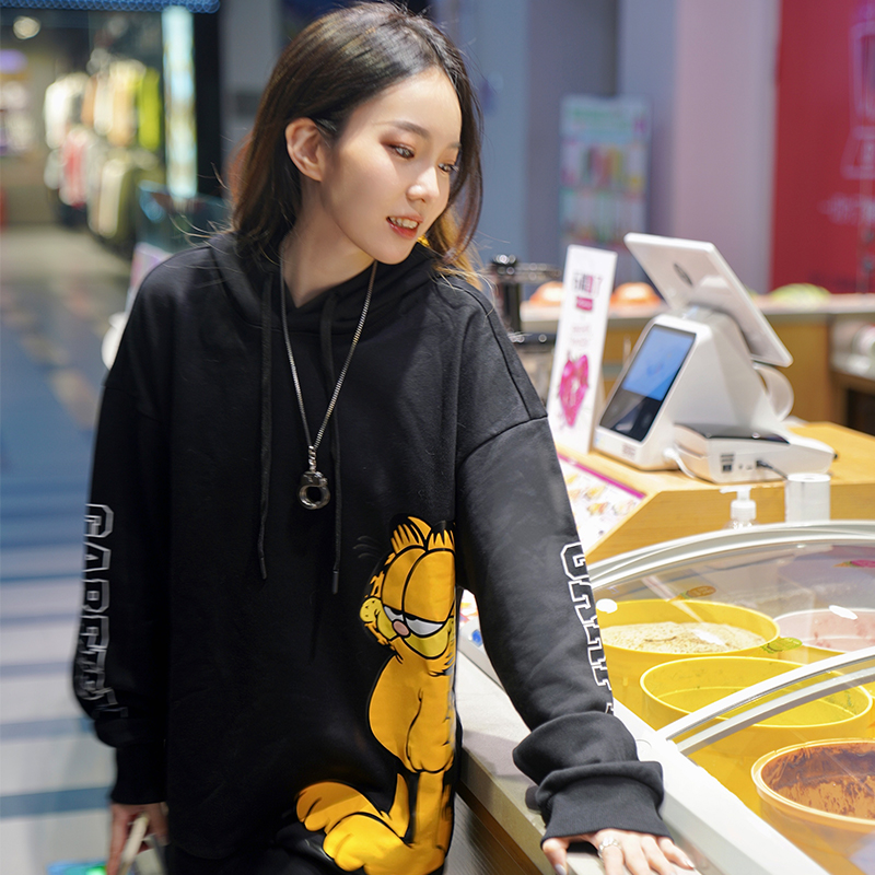 这是一款连帽卫衣,衣身采用了个性的印花设计,打破了纯色的单调,更显青春活力感。