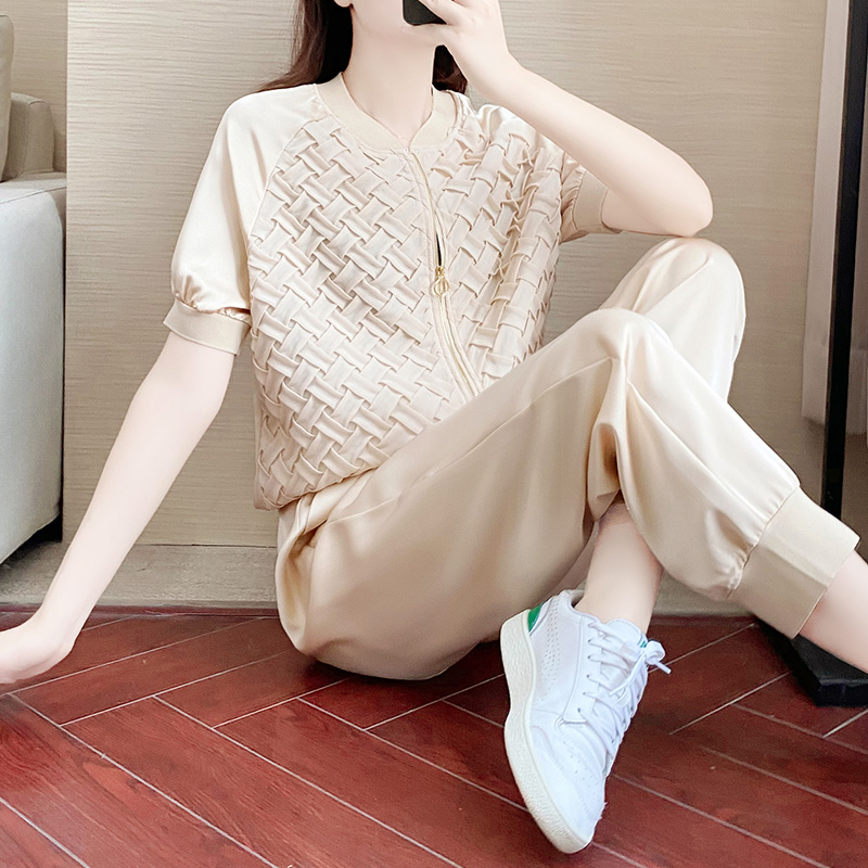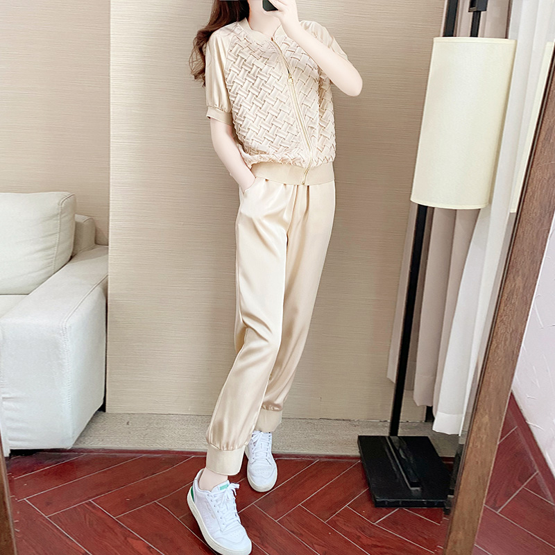 套装是两件套的设计,搭配上一件白色的T恤,就能轻松穿出时髦感。