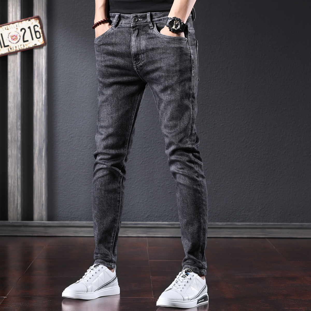 小脚裤型,修饰腿部线条,修身版型,凸显身材曲线,灰色的色调,时尚又百搭,宽松裤型,穿着舒适自在。