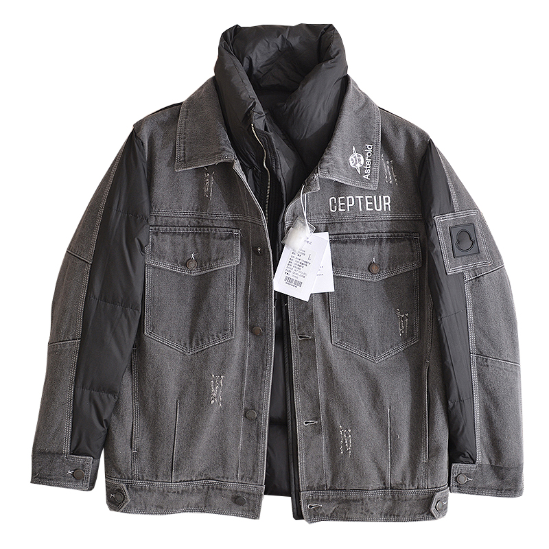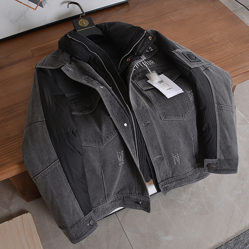 宽松版型,穿着舒适自在,假两件设计,层次感十足,牛仔面料,穿着舒适透气,白鸭绒填充,轻盈又保暖。
