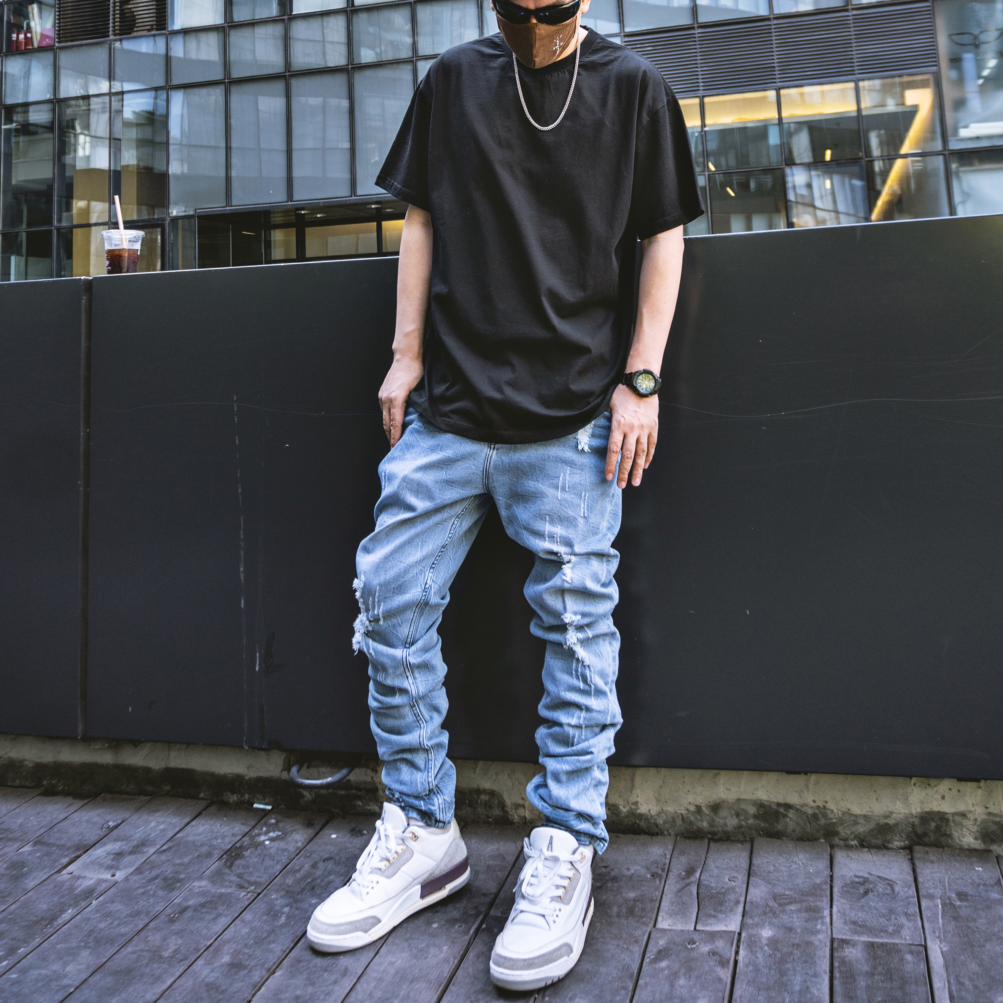 这款牛仔裤采用了水洗工艺,手感柔软,穿着舒适,修身的版型,上身效果很好,破洞的设计,增添了几分时尚感,搭配T恤或者衬衫都很好看。
