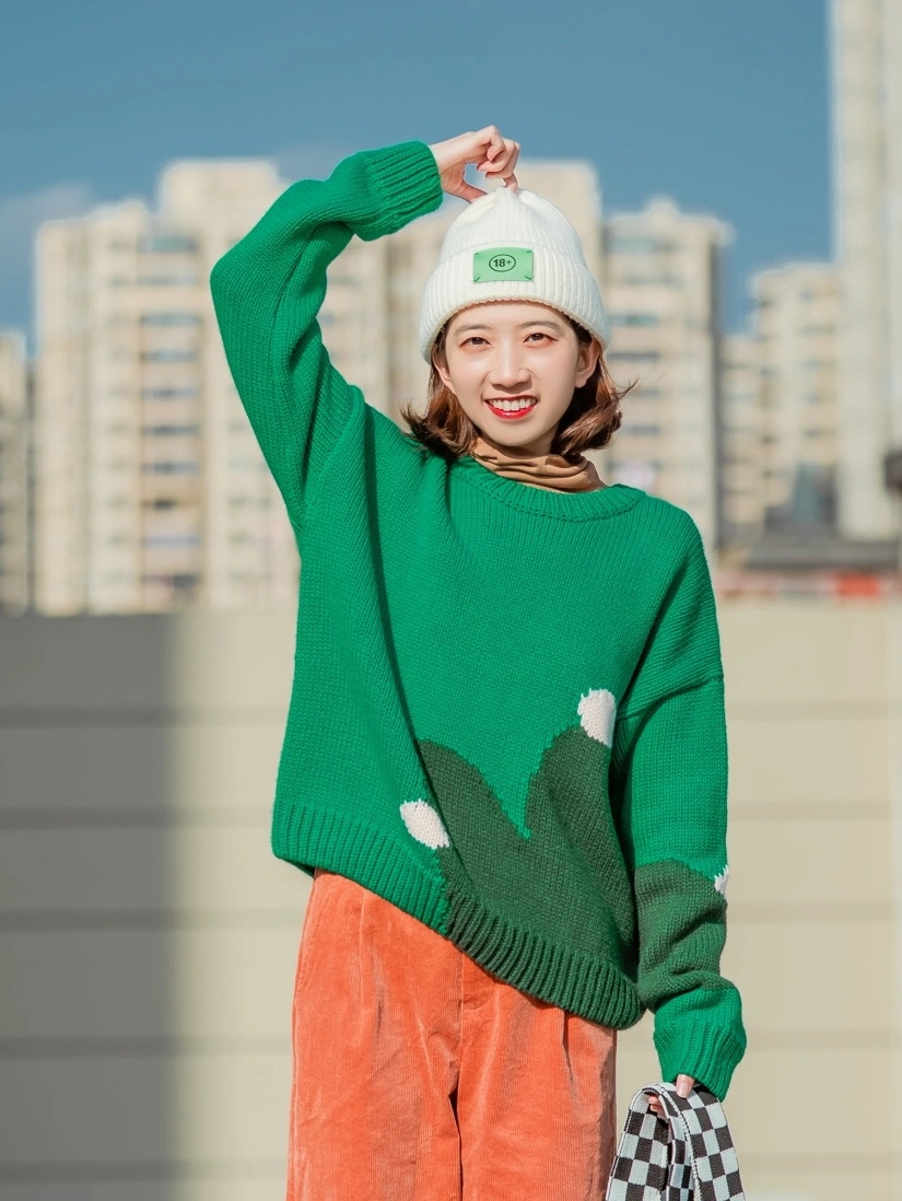 今天是我爱的**橙绿撞色穿搭n绿色仙人掌图案毛衣内搭棕色堆堆领打底,搭配暗橙色灯芯绒阔腿裤,整体配色复古又亮眼。