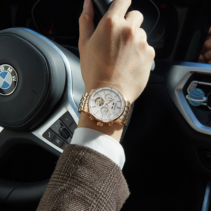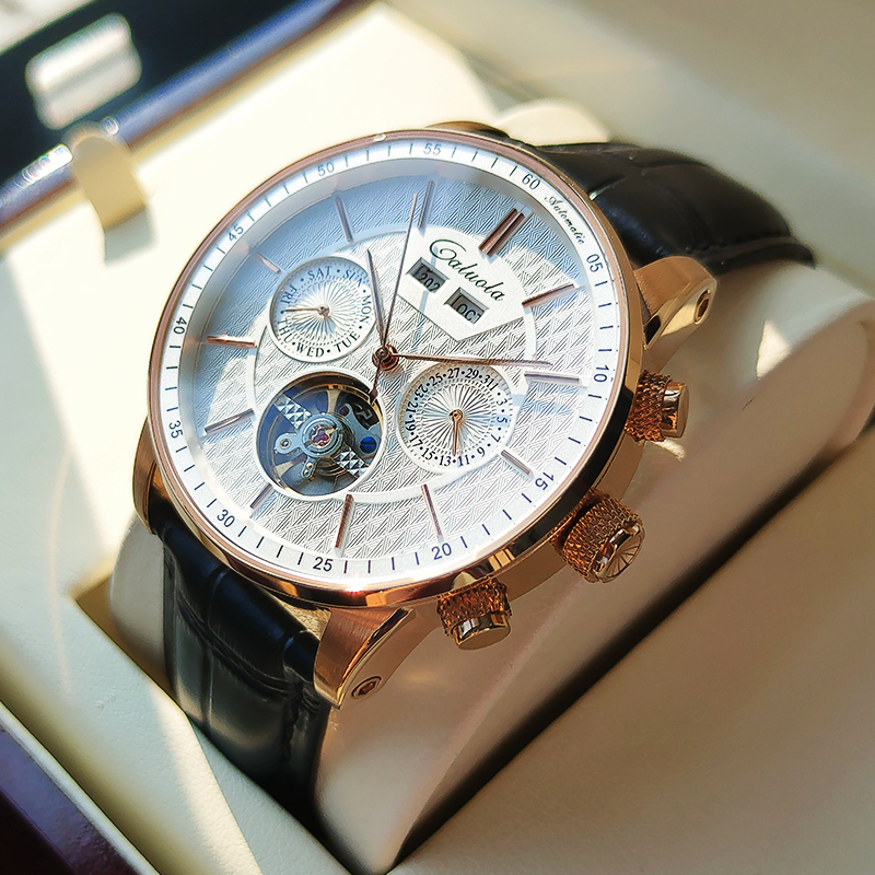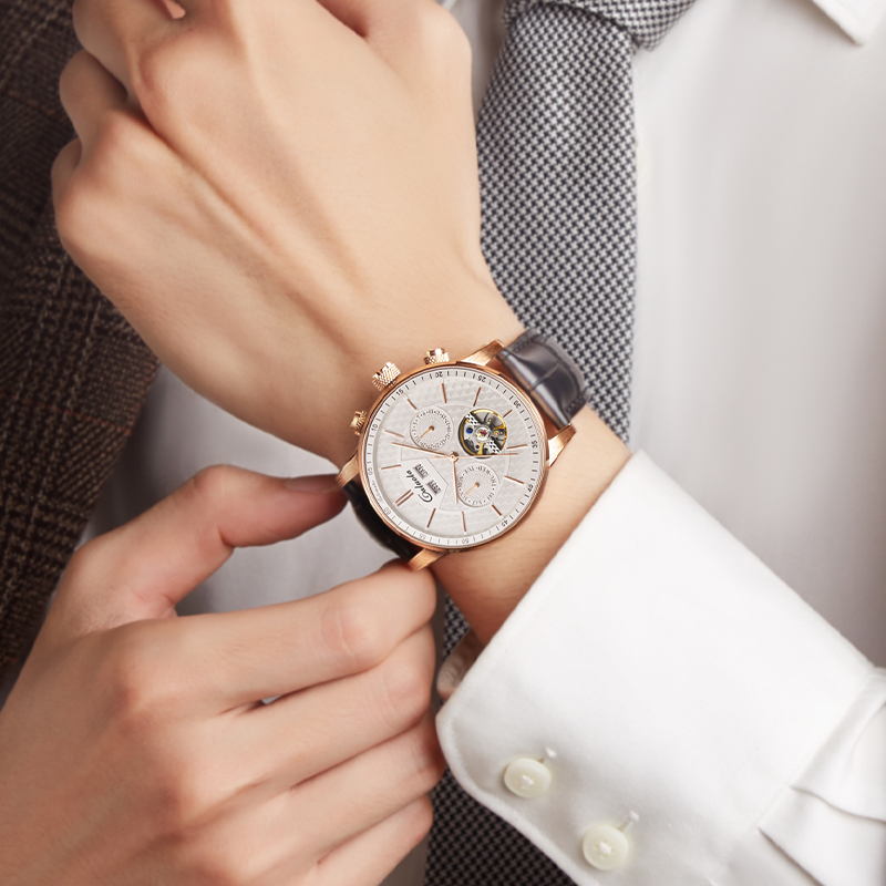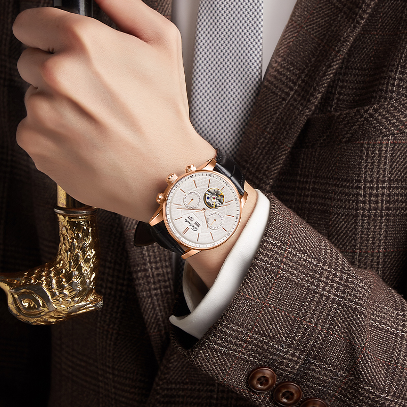 真皮材质,彰显绅士气质。全自动机械机芯,性能稳定。表盘设计,彰显男士魅力。