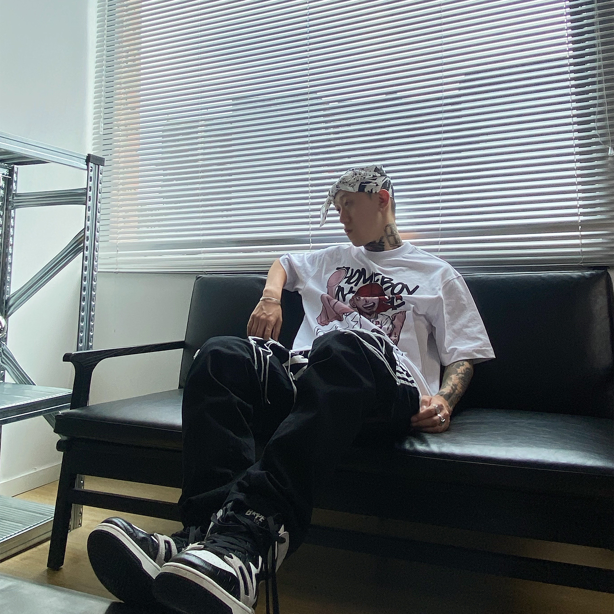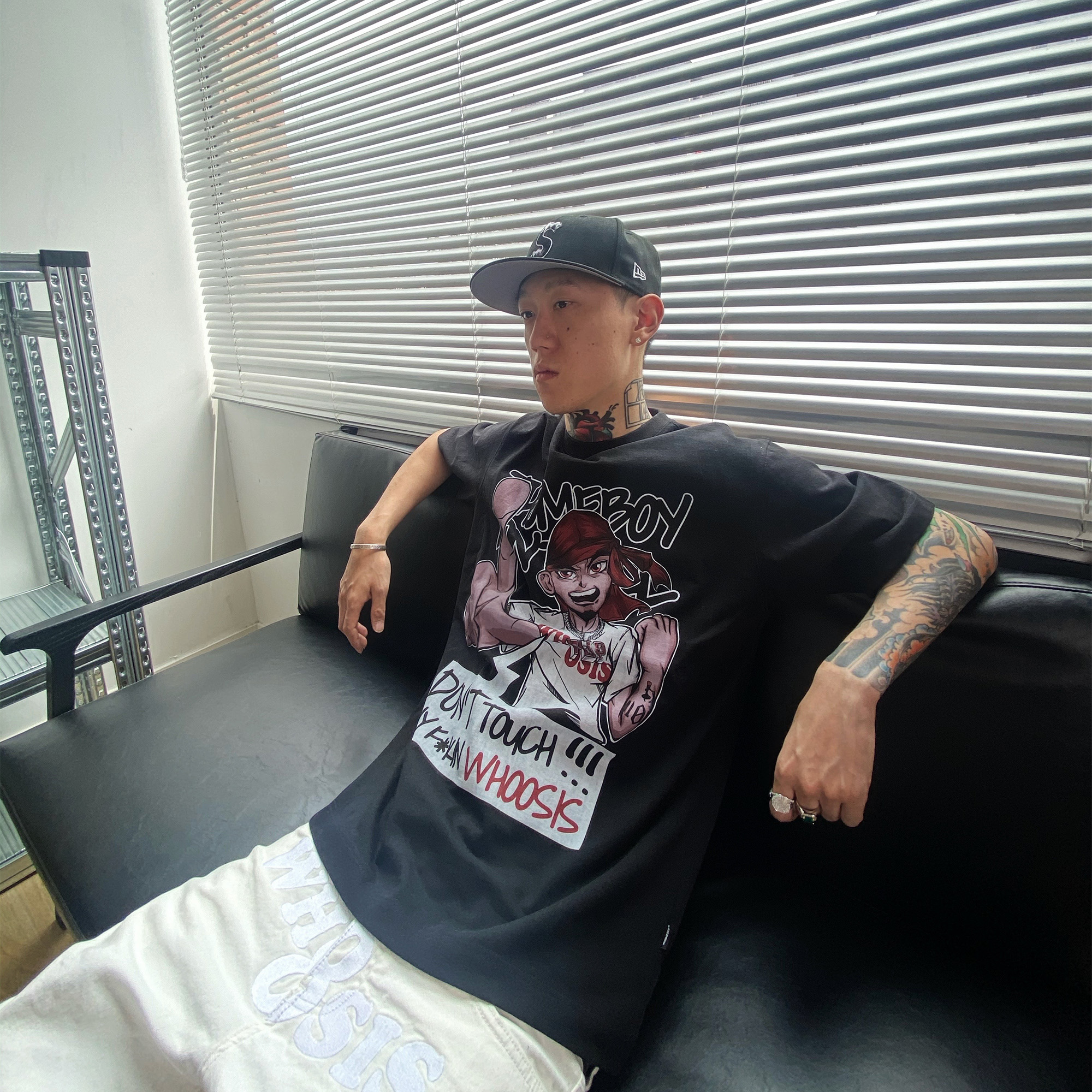 这款t恤来自原创潮牌,衣身采用了个性的卡通印花图案,充满了童趣感,同时也为整体增添了几分趣味性。