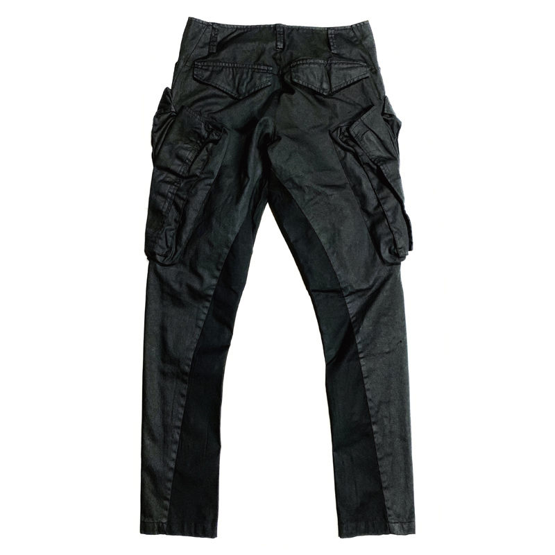 小脚裤型,修饰腿部线条,修身版型,凸显身材曲线,暗黑色调,彰显神秘魅力,多口袋设计,工装风十足。