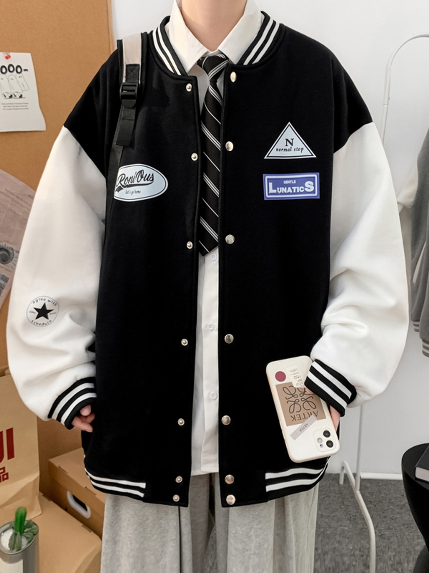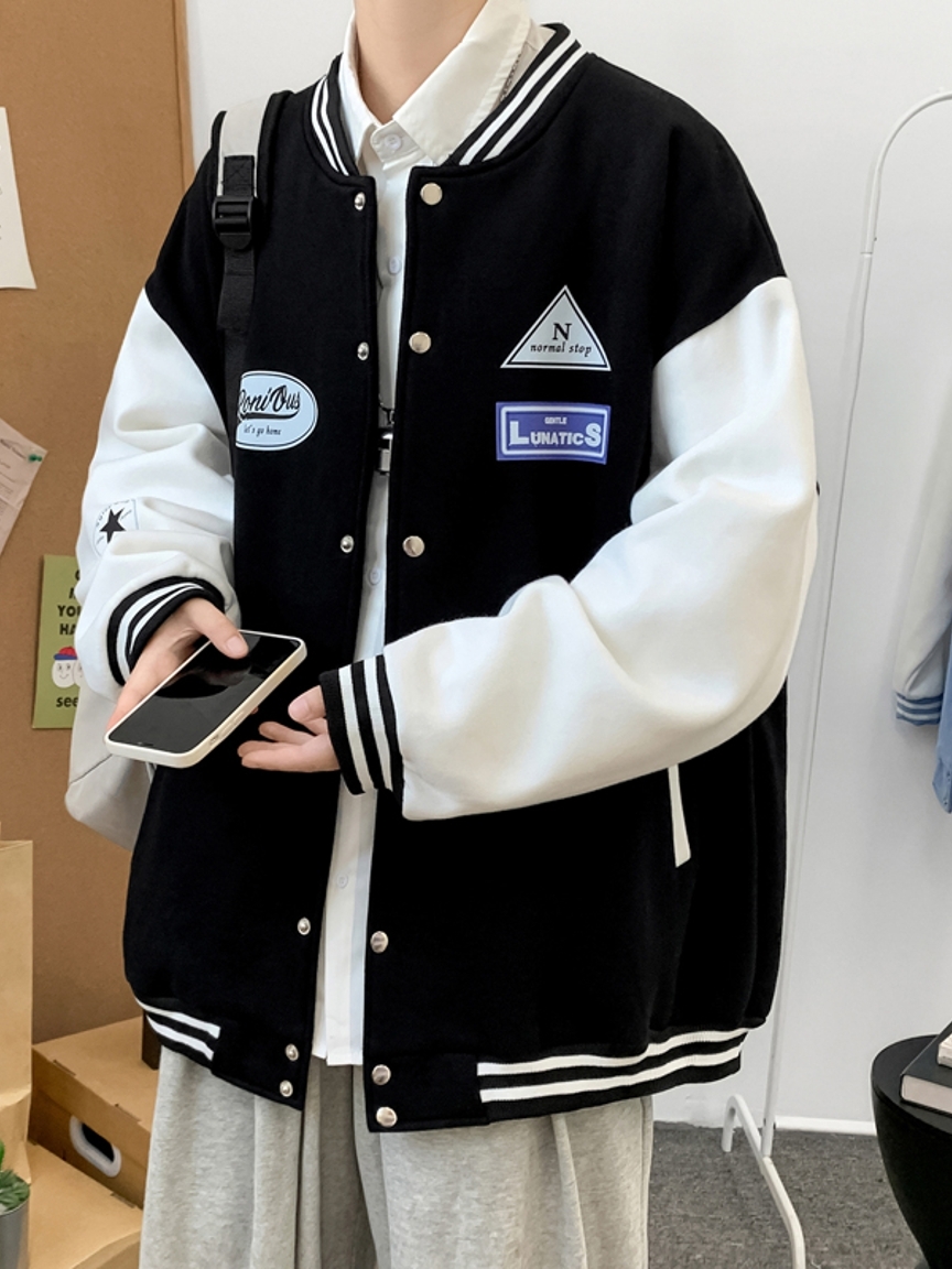 这款帅气有型的男款棒球服外套,休闲又百搭,内搭一件白色的翻领衬衫,下身配上一条灰色系的休闲卫裤和一双运动休闲鞋,满溢着青春活力气息。