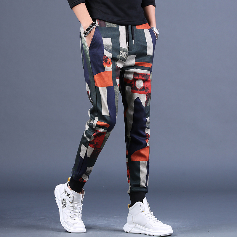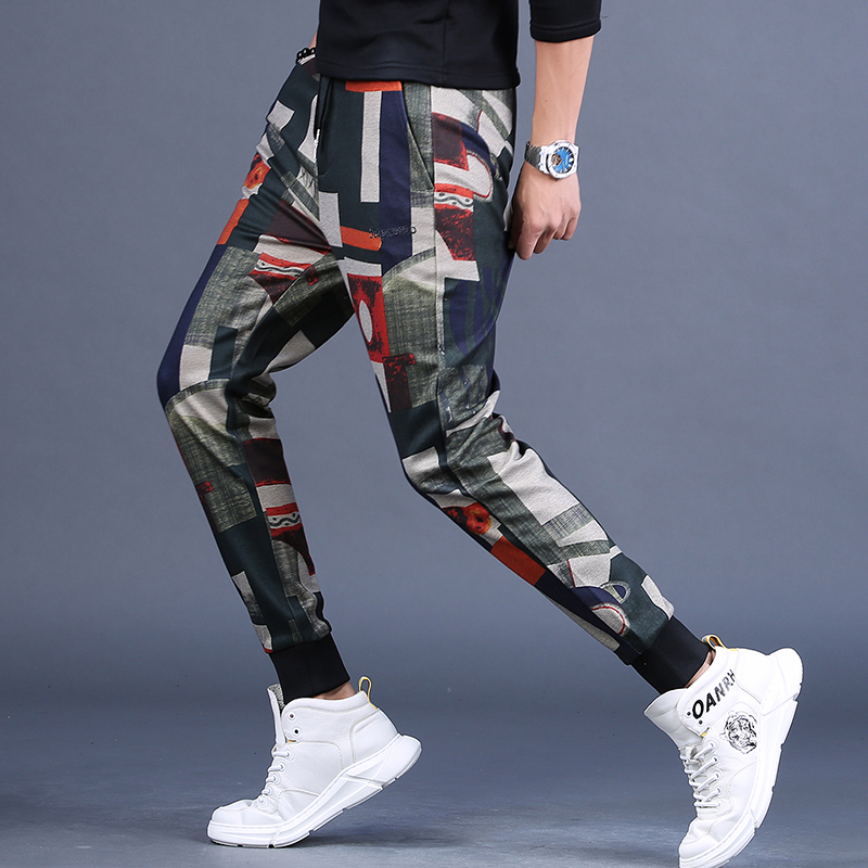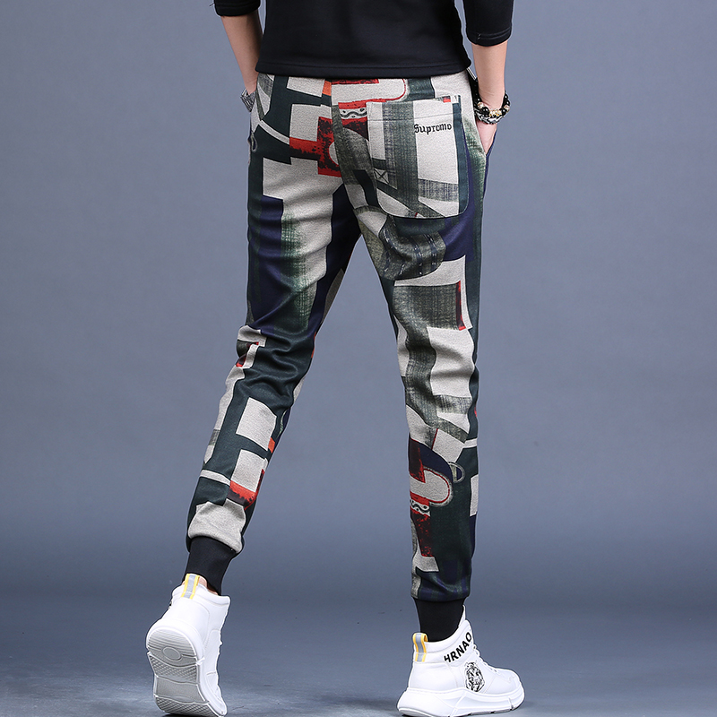 秋冬季新款休闲男裤子韩版潮流花色束脚长裤修身小脚印花运动裤潮