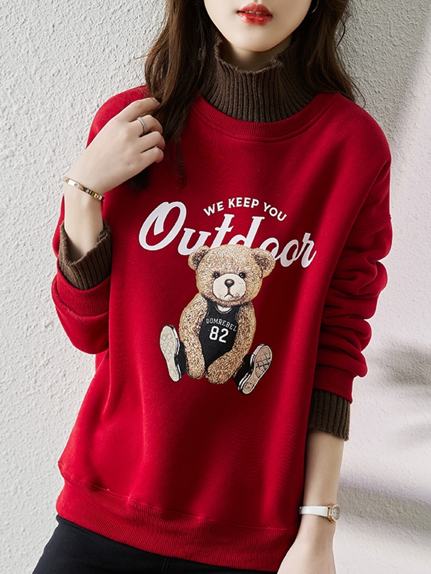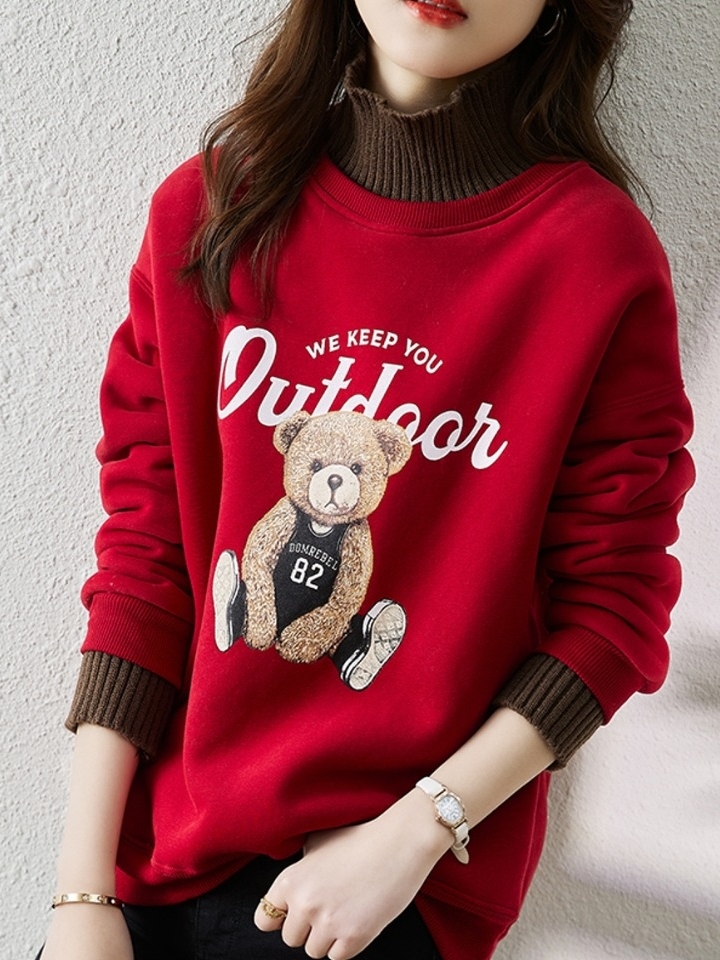 红色的色调,一眼看去就觉得很鲜艳喜庆,更是衬托白皙肤色的利器,胸前的小熊图案,充满了童趣,能尽显出小女生可爱的一面。