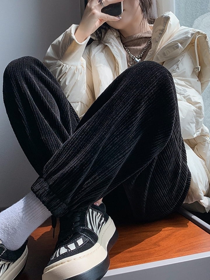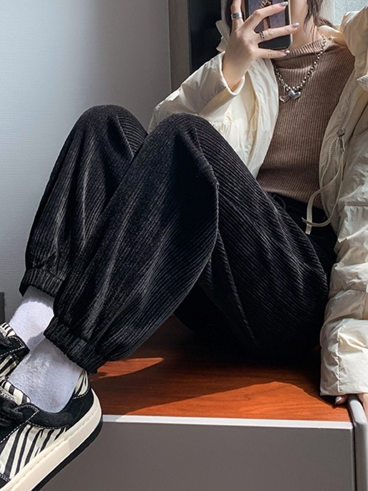 灯芯绒的面料材质很好,带着亲切感,又在亲切感中展现高档的奢华感。收口的弹力裤脚丰富着造型,穿着舒适方便,整体尽显潮范。
