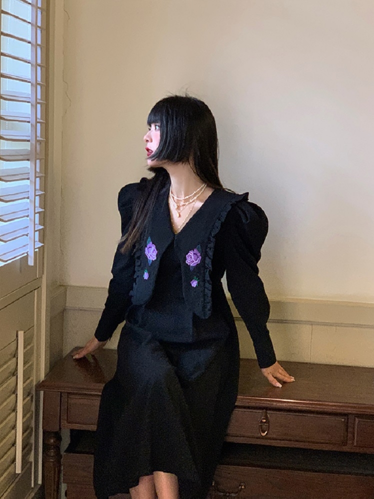 这款上身透着一股甜的小女人味,娃娃翻领甜美减龄,还有点小重工!前胸的花型,是全部手绣,工艺文艺感的花朵和枝叶,精致感满满。