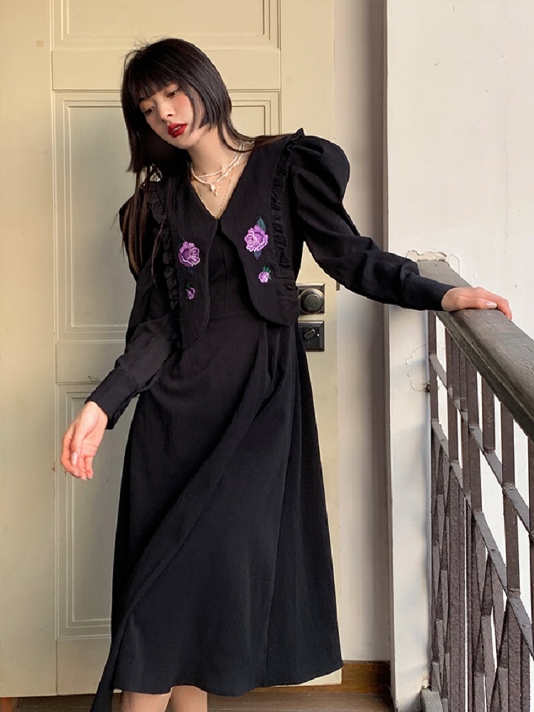 微宽松裙身修饰身材比例,上身自在随性,泡泡袖身柔和,肩膀线条显瘦有型,娃娃领增添层次感,摩登减龄,紫色的刺绣是点睛之笔。