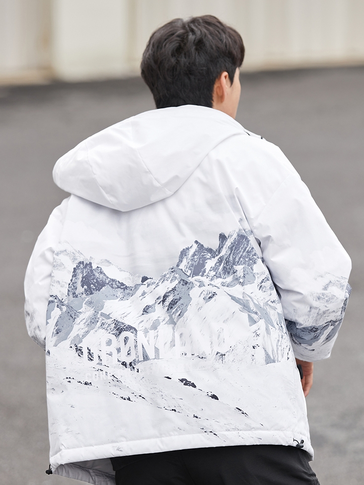 轻奢体验银狐毛领这款户外风格羽绒服,衣身满版的雪山迷彩图案,寒冬季强御寒长款版型尽显奢华气质内里填充上等鹅绒。