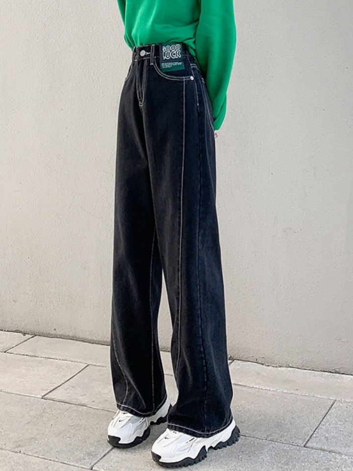 高腰设计,拉长身材比例。高腰牛仔裤,显瘦显腿长。直筒裤型,修饰腿部线条。