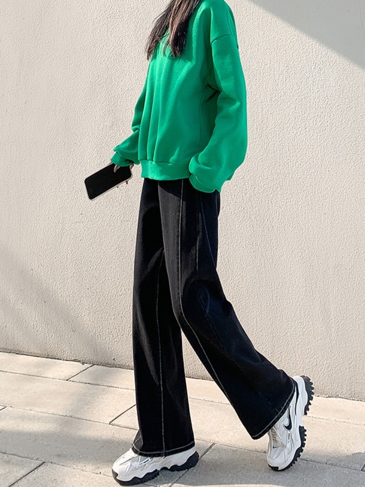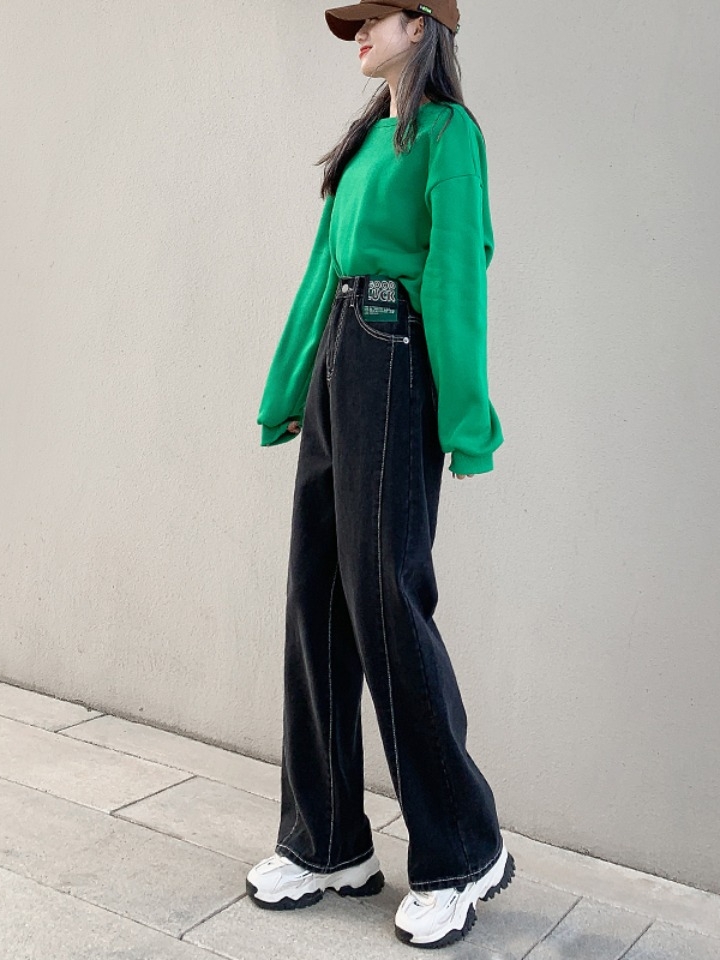 这款高腰直筒牛仔裤在搭配的时候,可以选择一件绿色的卫衣进行搭配,再配上一双白色的运动鞋,显得很是休闲美观。