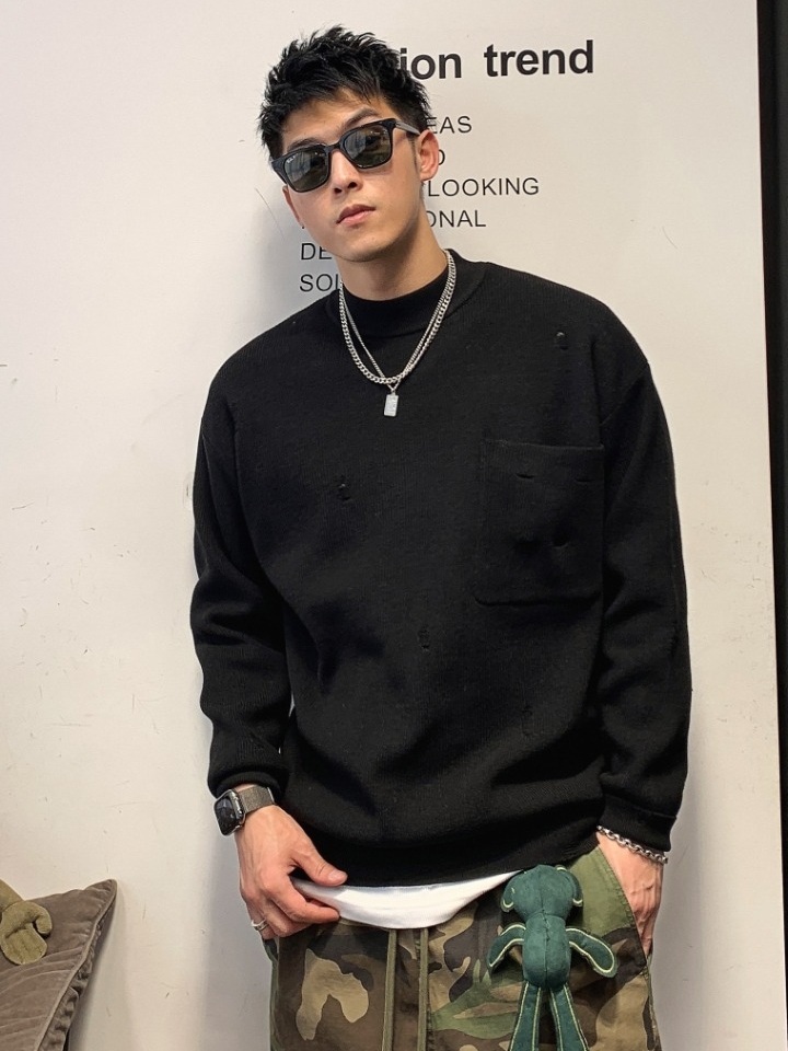 简洁的纯色,赋予了极大的搭配空间,就算穿一条迷彩的休闲裤,也丝毫没有违和感,加上一根项链的点缀,就很有街头时髦感。
