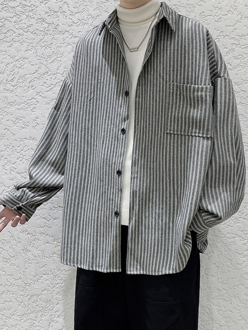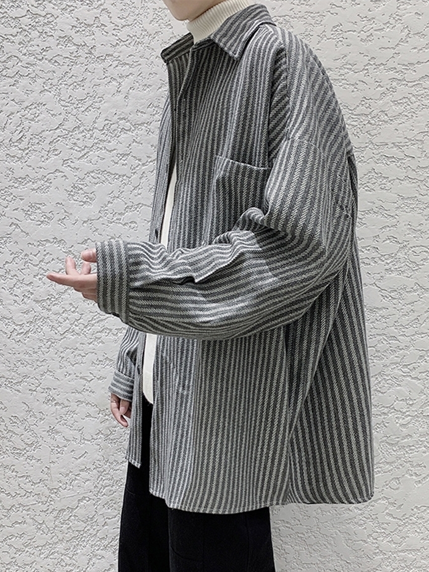 这是一款复古港风的竖条纹衬衣,衣身的版型设计的比较宽松,很好的包容了各种身形,上身不会有任何的紧绷感。