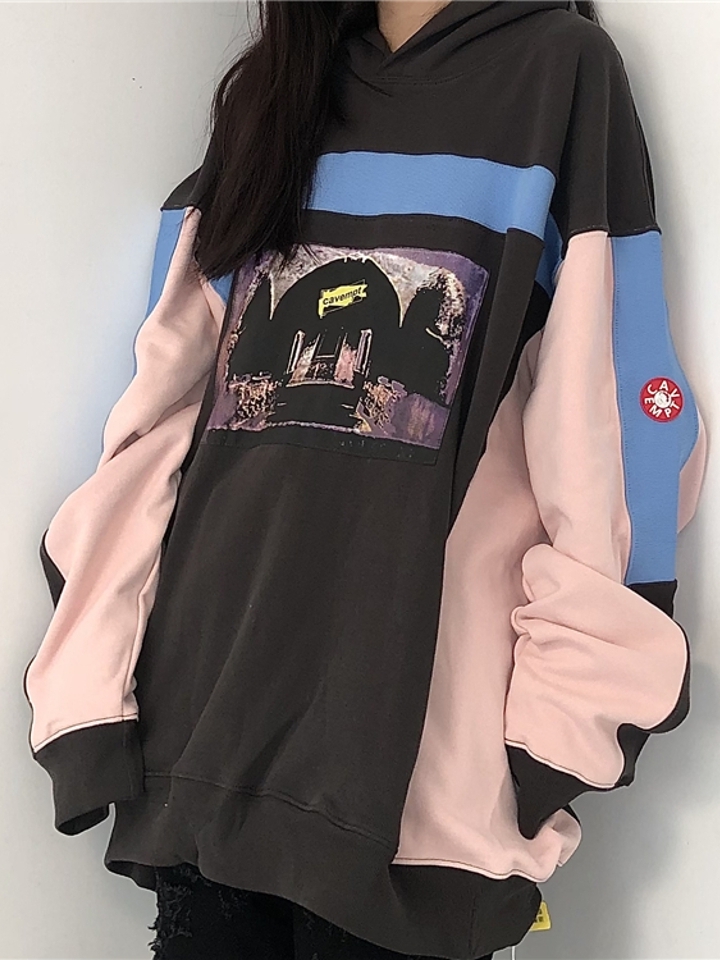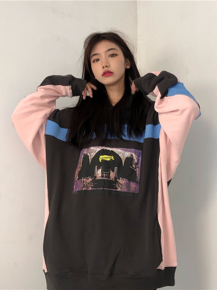 这是一件比较长的卫衣,版型也很宽松,连帽抽绳设计的卫衣,搭配撞色拼接和贴布印花,休闲舒适的同时也很有个性。