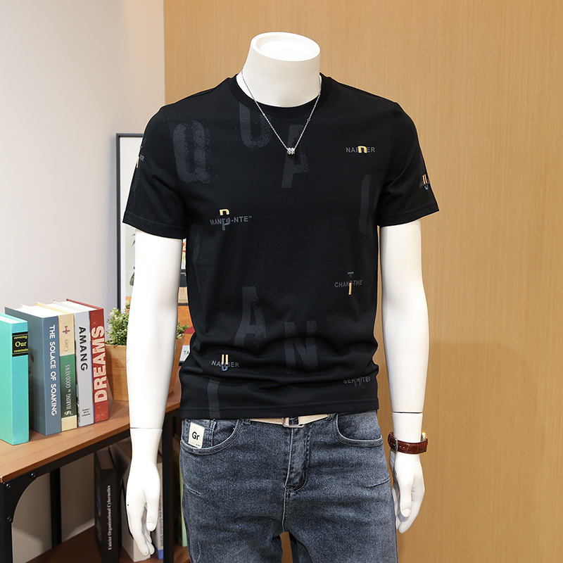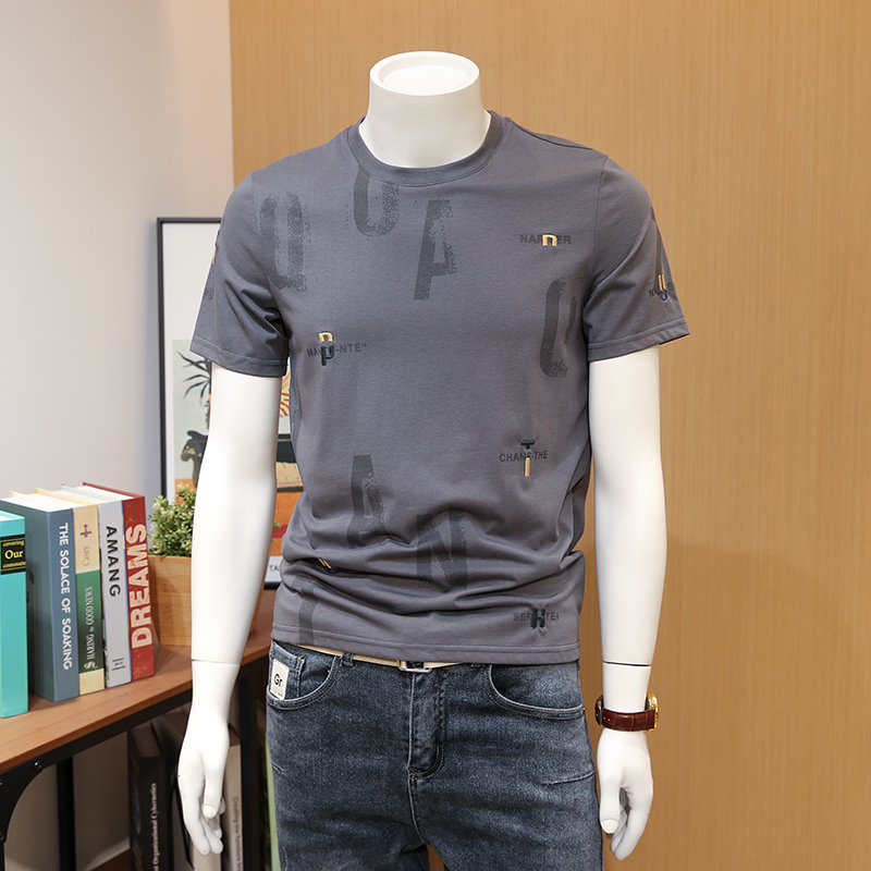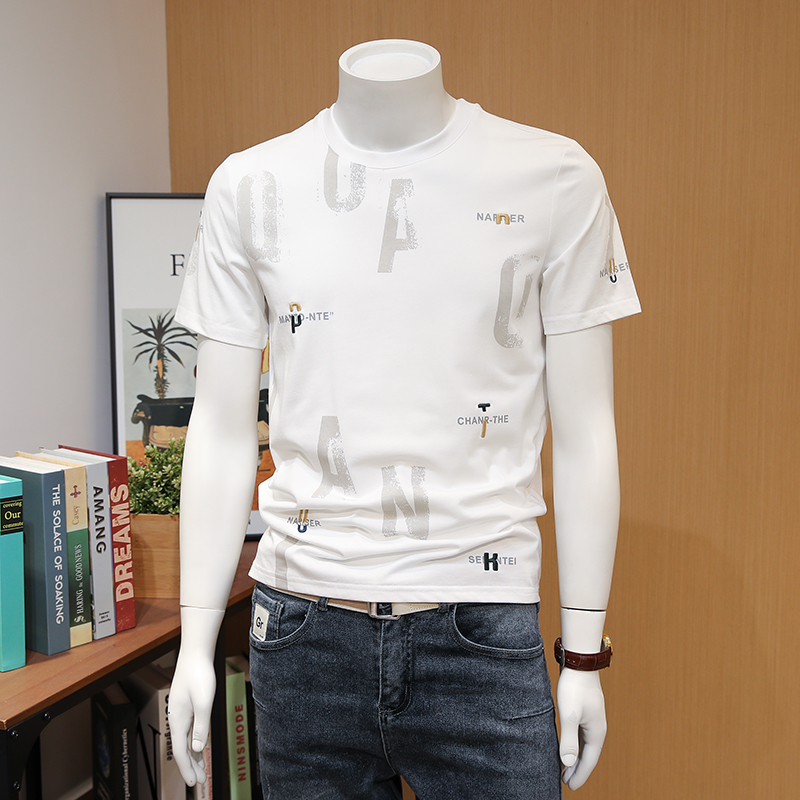 胸前字母印花,个性时尚,短袖设计,修饰手臂线条,圆领设计,彰显绅士气质。