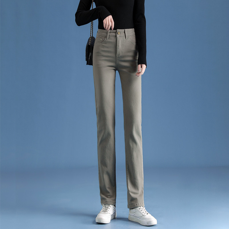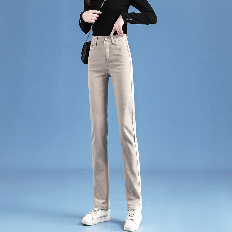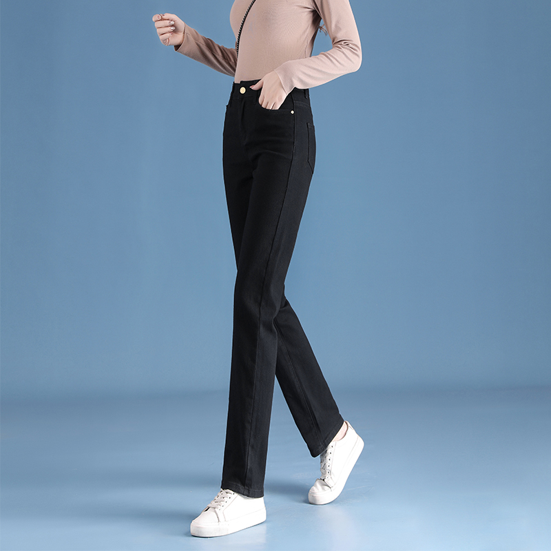 高腰设计,拉长身材比例。高腰牛仔裤,显瘦显腿长。直筒裤型,修饰腿部线条。