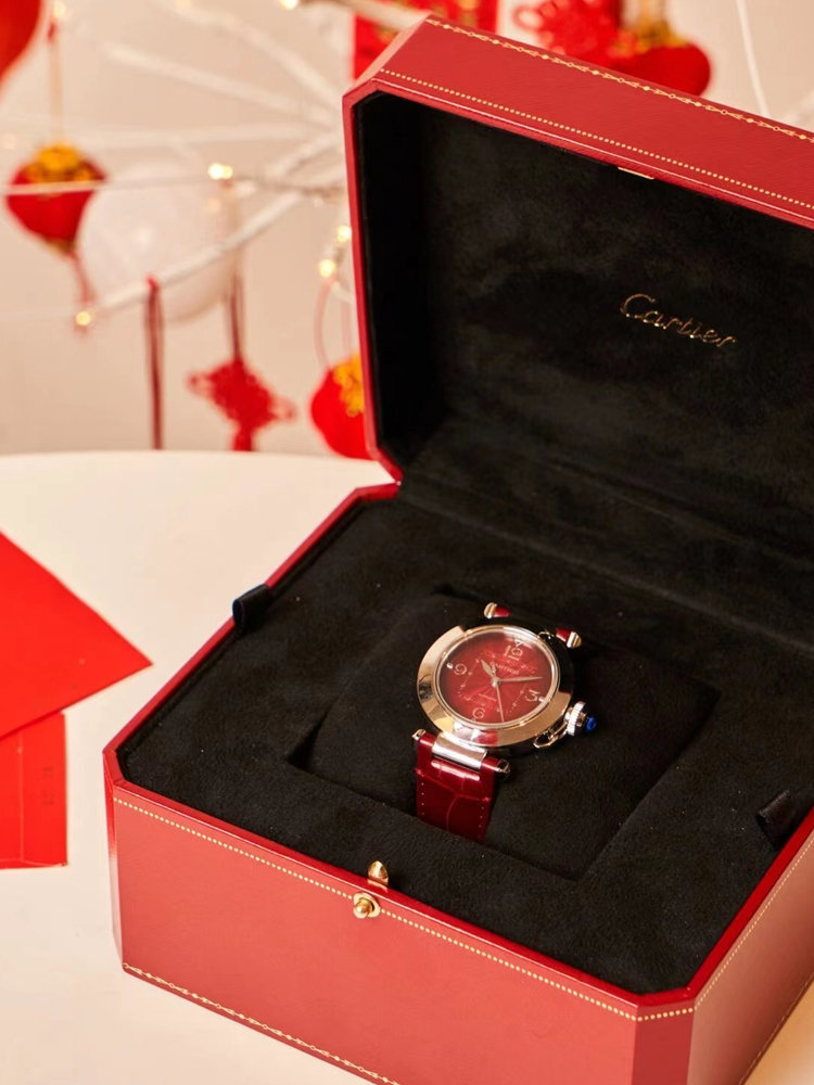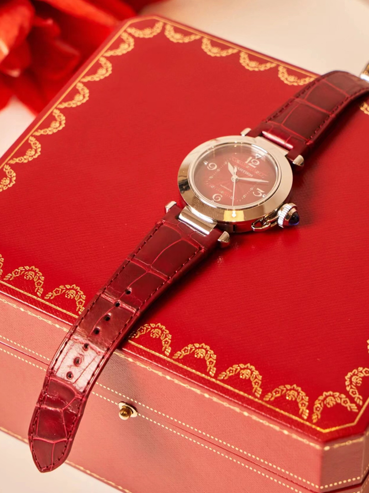 Cartier这款机械手表,银色表盘配红色表带,简直就是美学艺术。个人还是喜欢银色表盘,最简单,最经典,简约而不不简单。