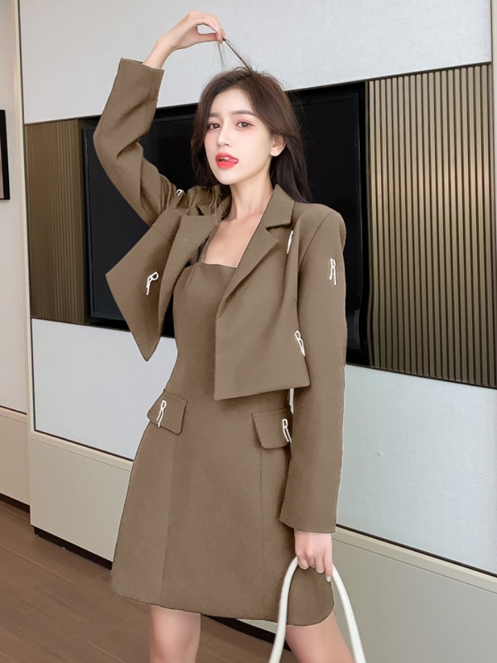 正式感的西装搭配性感的吊带裙,让干练与女人味混于一身,卡其色的套装呈现出高街时尚感,走出成熟自信的姿态,分开搭配也可以,令你造型多变。