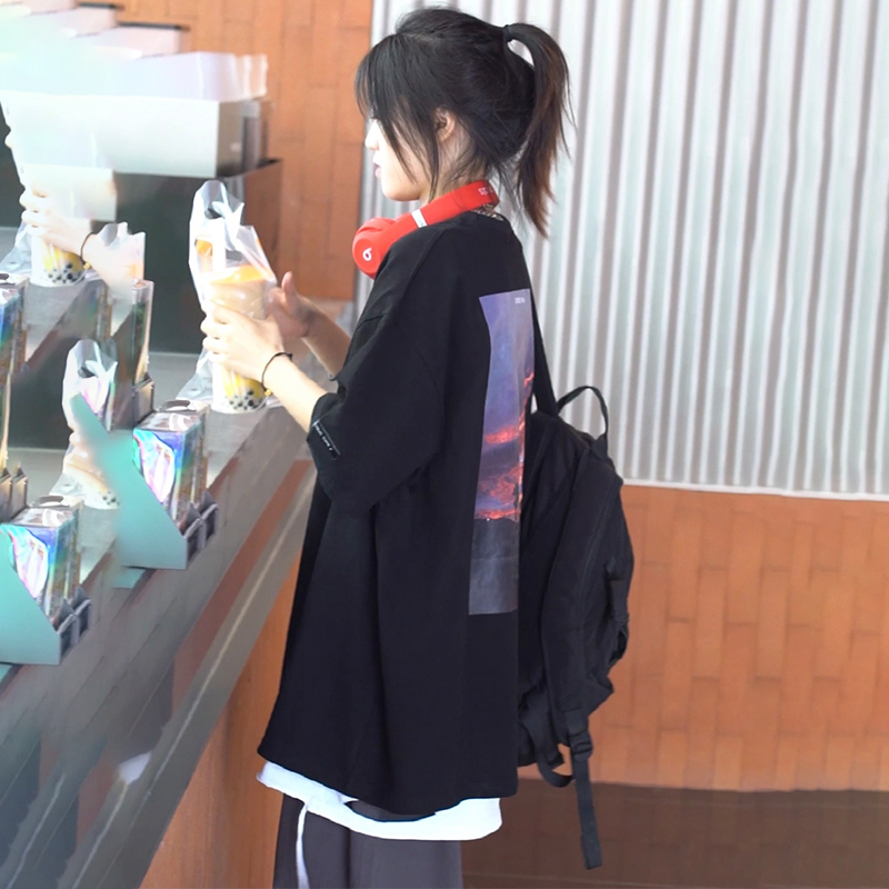 这款t恤是简约的风格,宽松的版型,时尚百搭,胸前的字母印花,很有个性,搭配牛仔裤或者短裤都很好看。