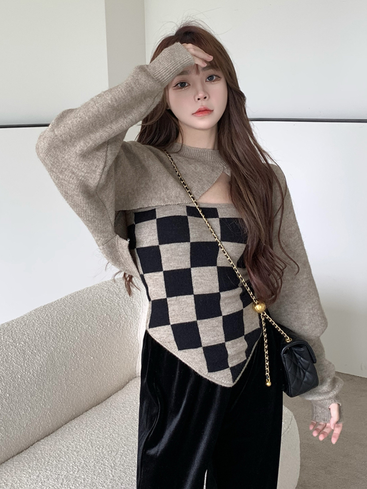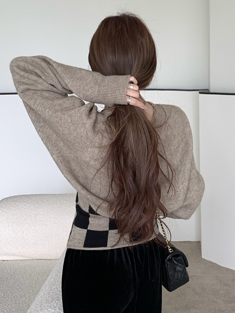 宽松的针织廓形,时格又气质,上衣的格纹图案,给整体增添一种优雅的清新气质,使整体更具满满的复古气息。