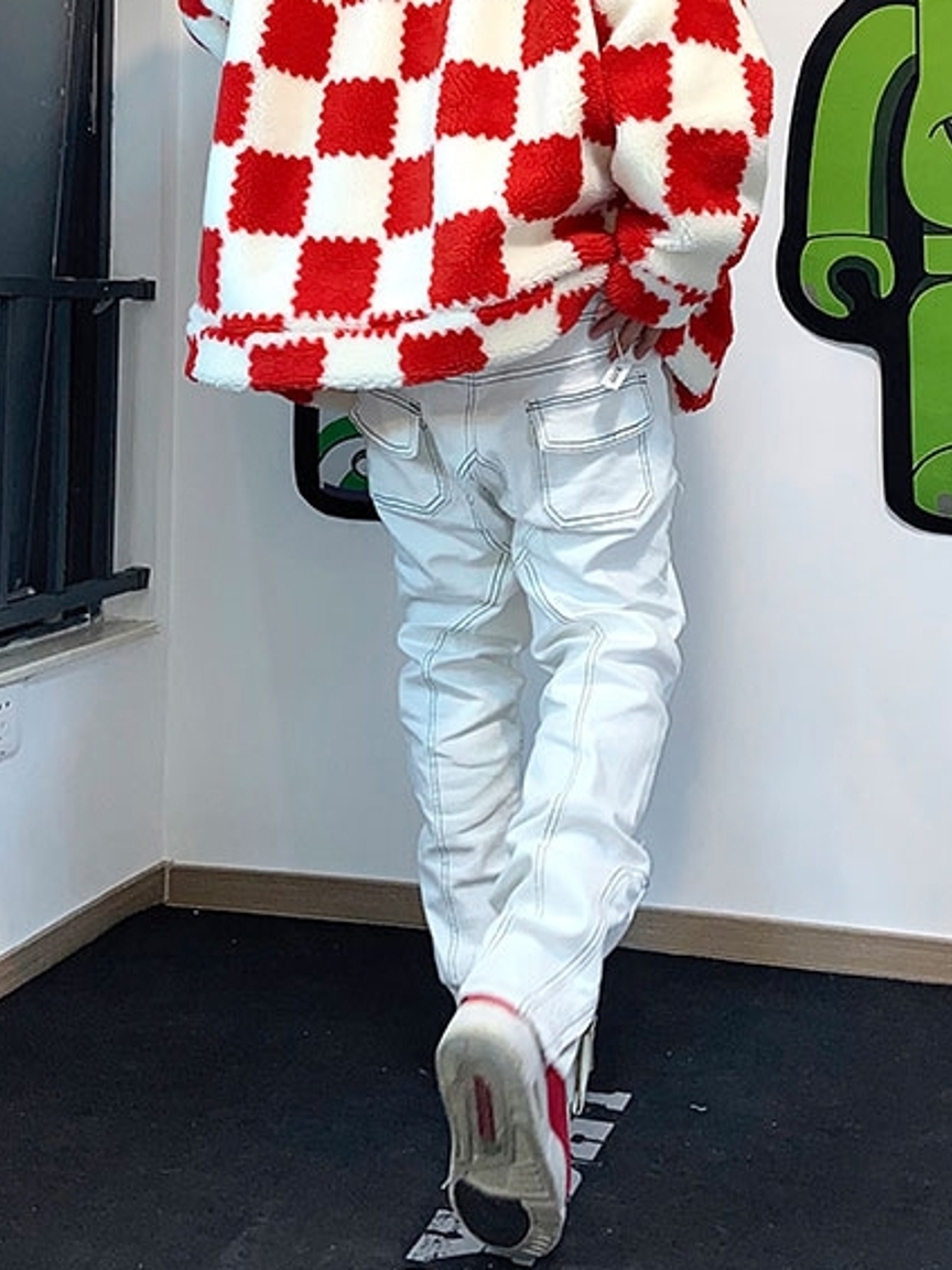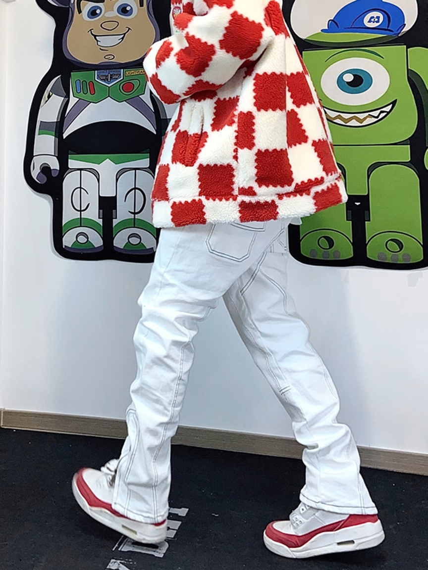 这条充满着美式高街范儿的牛仔裤,休闲又百搭,上身搭配一件红白棋盘格的毛绒外套,再搭配一双红白相拼接的板鞋,休闲又个性。