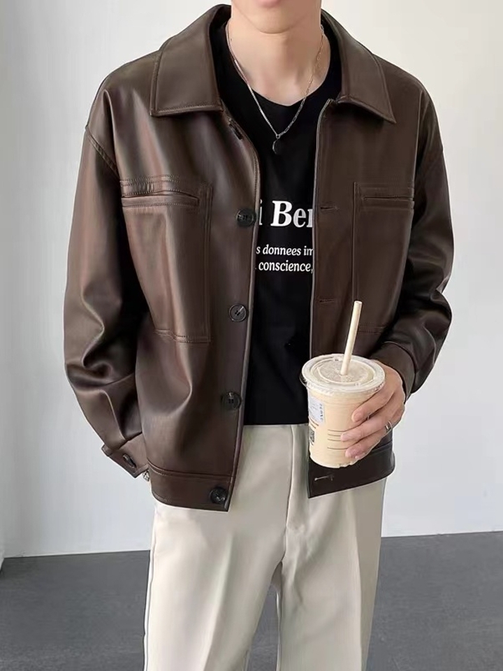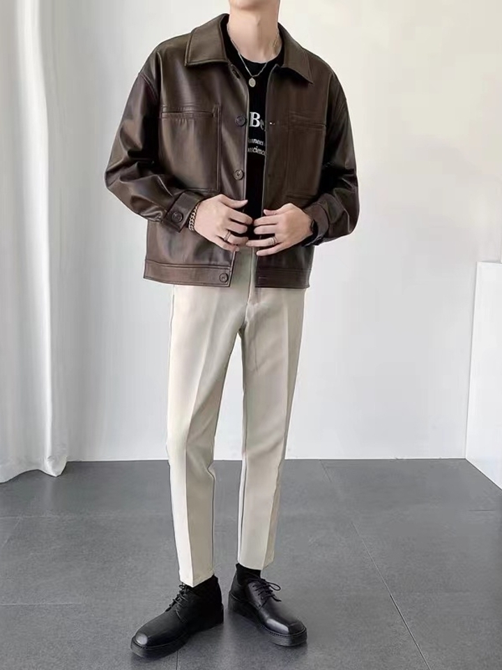 尽显街头范的格调,简洁中更加吸引人。彰显帅气街头范的感觉,领口采用翻领设计,个性十足,帅气潮流的颜色,采用仿羊皮的制成。