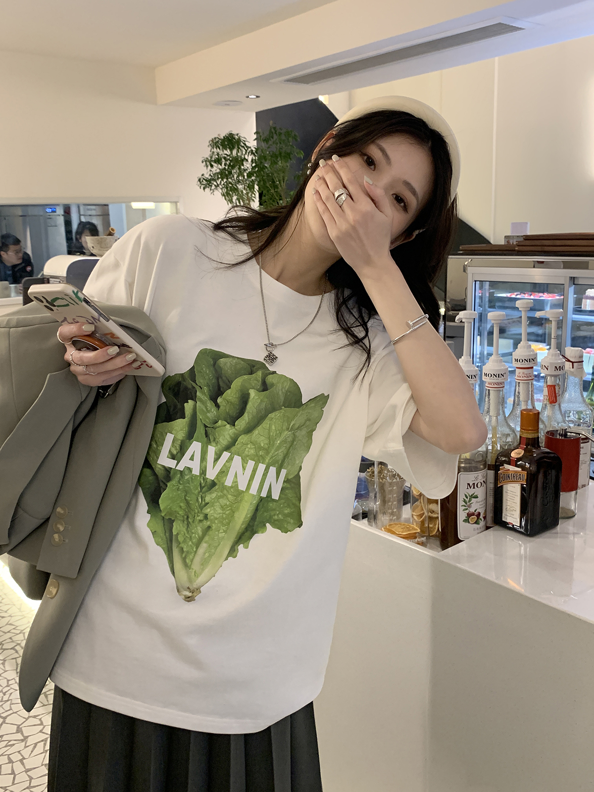 这是一款纯黑色百搭打底纯棉t恤,精致的圆领造型,彰显一丝甜美的气息,胸前小海豚的刺绣点缀,增添了俏皮可爱的感觉,宽松休闲的版型,视觉上很是显瘦减龄。