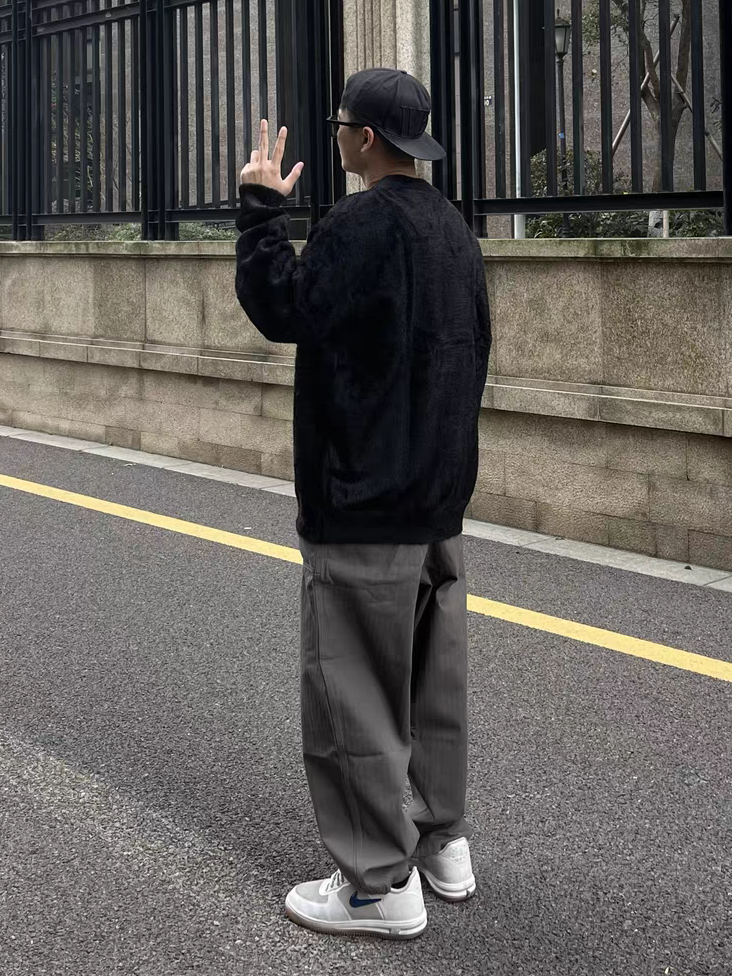 选用的是仿貂毛的材质,毛底丰厚密实,而且非常柔软,贴身穿着亲肤无刺激,非常适合秋冬穿着,温暖细腻。简洁的圆领样式,版型剪裁比较宽松,上身自在随性,搭配毛茸茸的材质,自带慵懒的气质。