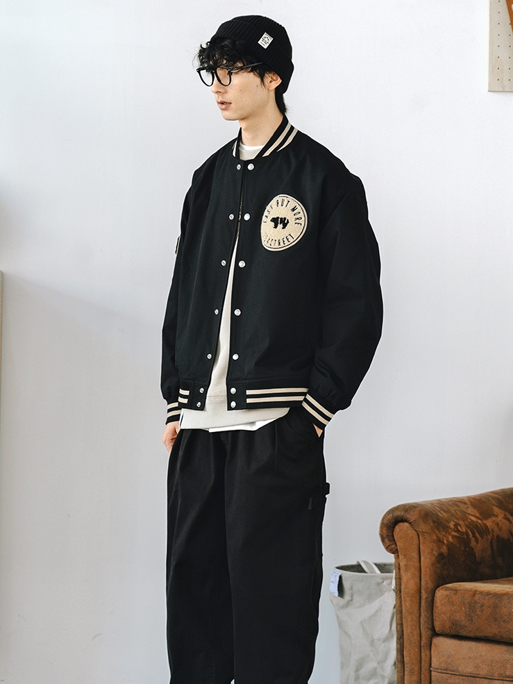 棒球服外套充满休闲风气质,内搭恤和哈伦裤上身自然的宽松版型不挑版型,一丝街的味道油然而生,刺绣提升质感时尚显气质。