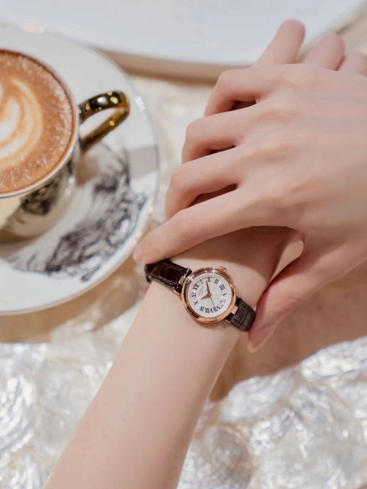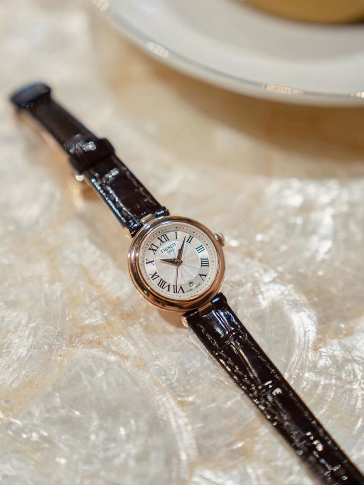 Tissot这款手表,整体采用复古风格,感受时代魅力。清新的白色表盘,结合棕色的表带设计,轻松表现出文艺的风范。