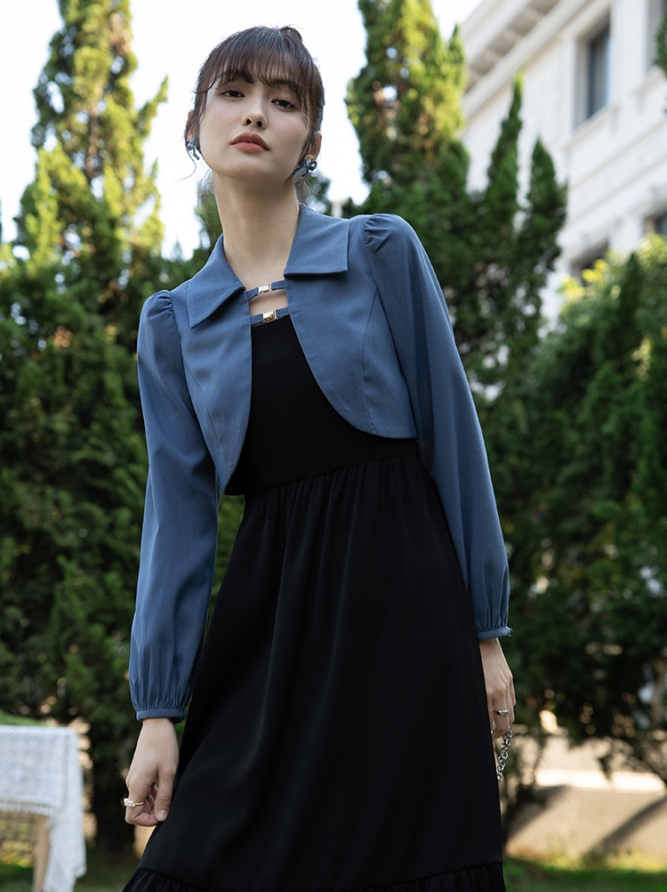 法式复古两件套连衣裙,经典的黑色衬衫加上内搭吊带裙的设计,将女性的柔美与清新展现的淋漓尽致。圆领的设计,将优美的颈部线条大展无遗,展现出独属于女性的风情美感。腰部收束的设计,勾勒出曼妙的身姿。