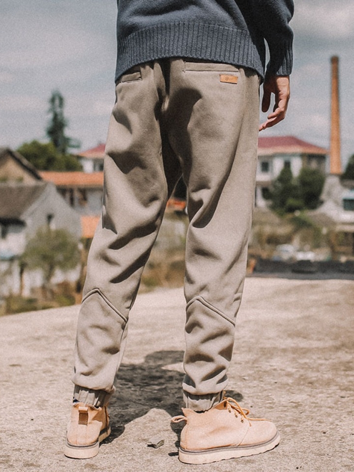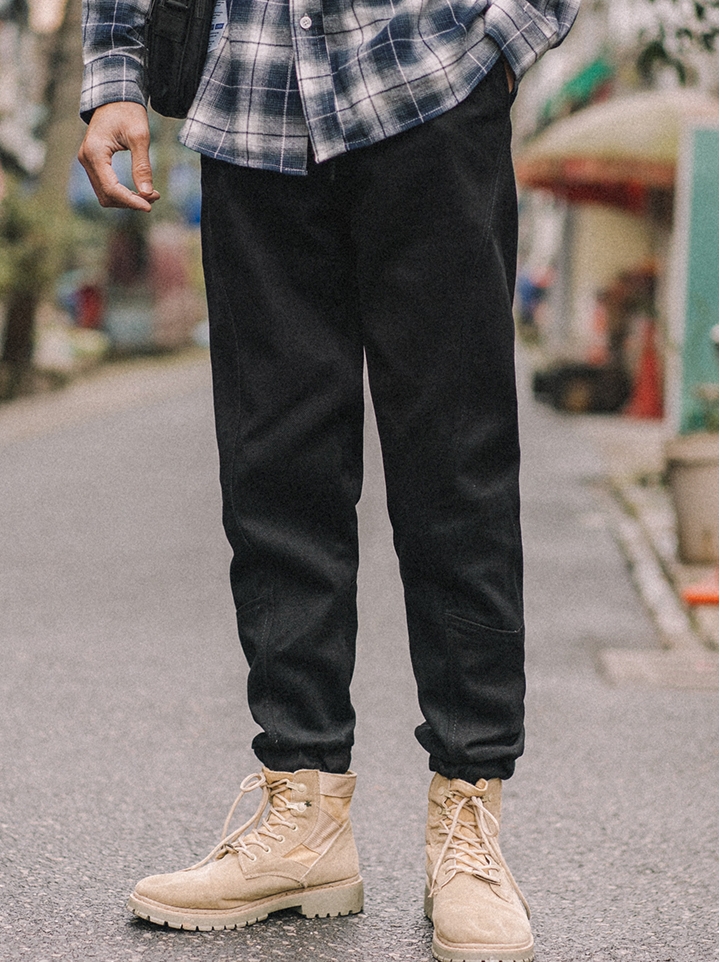 此款男士长裤工装版型宽松,上身舒适得体。定制的优质面料,内里加绒加厚保暖性能优越。整洁的纯色版面,两侧添加的口袋装饰呈现复古日系风格调。