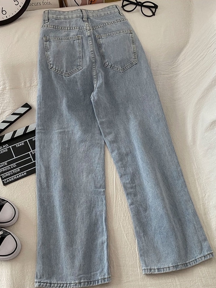 高腰设计,拉长身材比例。高腰牛仔裤,显瘦显腿长。直筒裤型,修饰腿部线条。