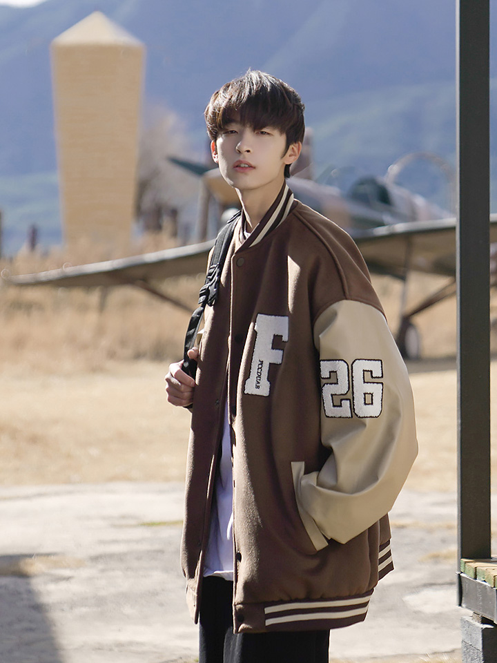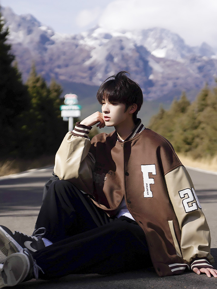 棒球服外套,采用了PU皮拼接植绒的面料打造,除了可以增强质感,还能让整体的版型更为挺括,领口、袖口和衣摆采用了针织螺纹拼接的设计,拥有良好的弹力,提升穿着的舒适度~提升立体感。