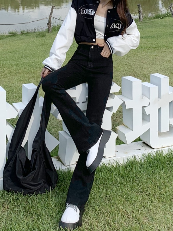高腰设计,拉长身材比例。高腰牛仔裤,显瘦显腿长。直筒裤型,修饰腿部线条。