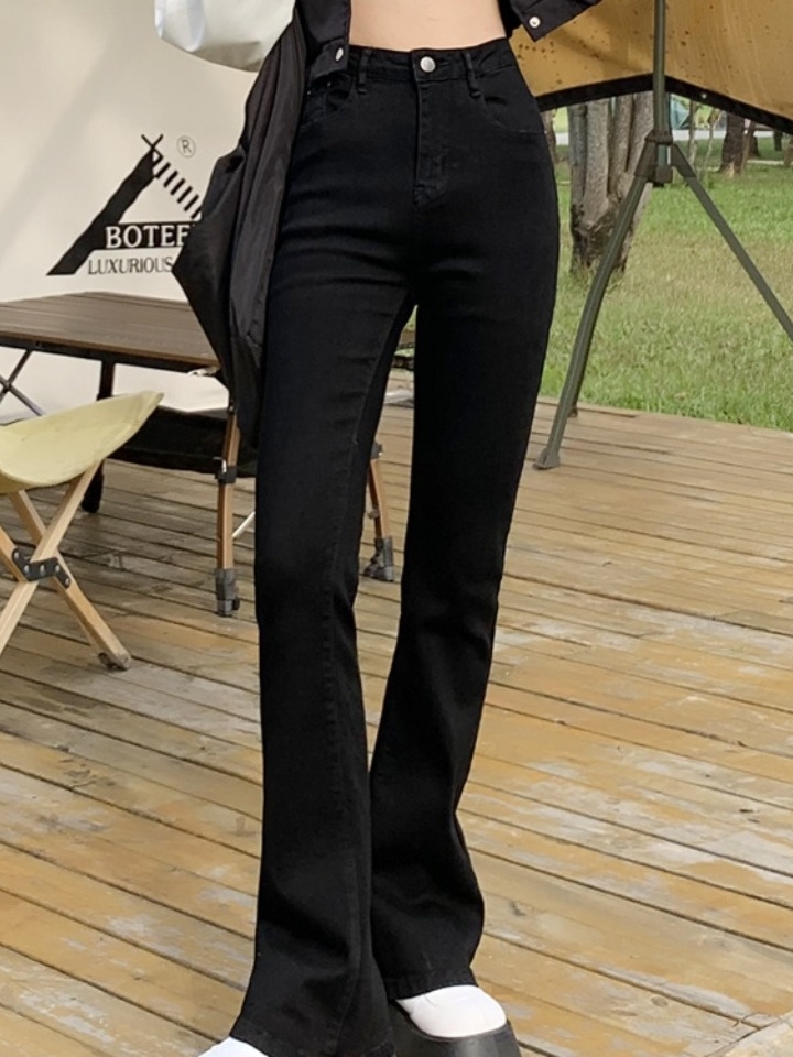 高腰显瘦收腹,裤脚毛边设计,潮流范儿十足。微喇叭裤腿给人轻松随意的上身感受。深灰色系,街拍达人必备的单品。