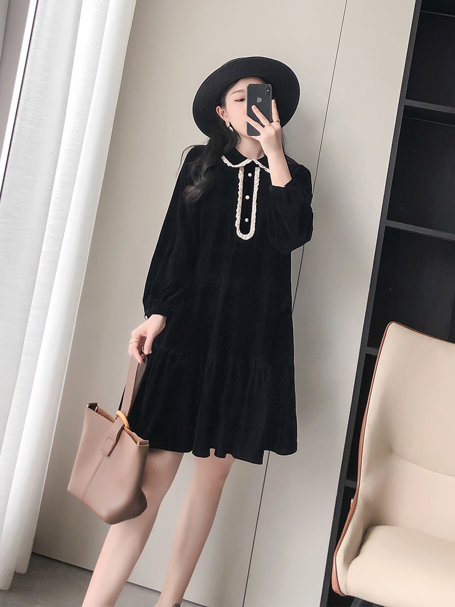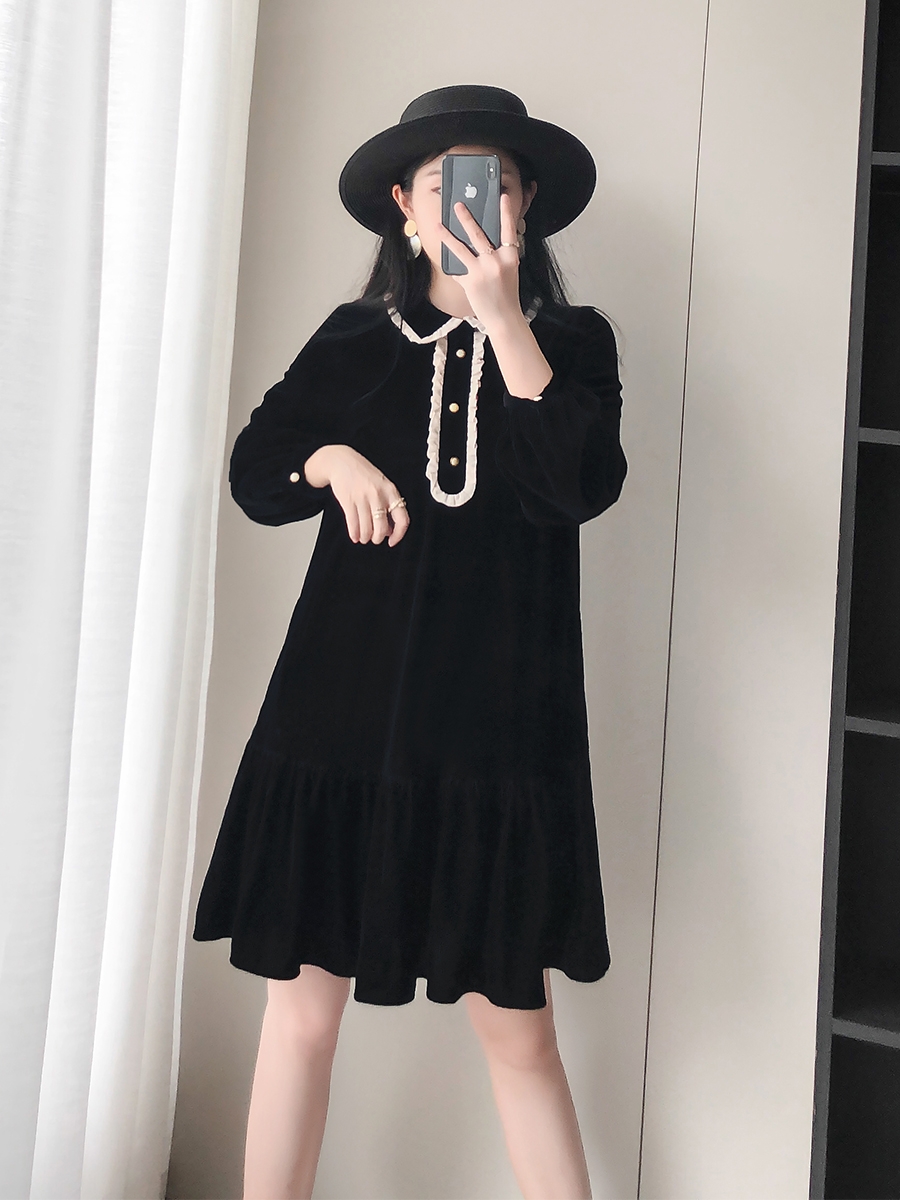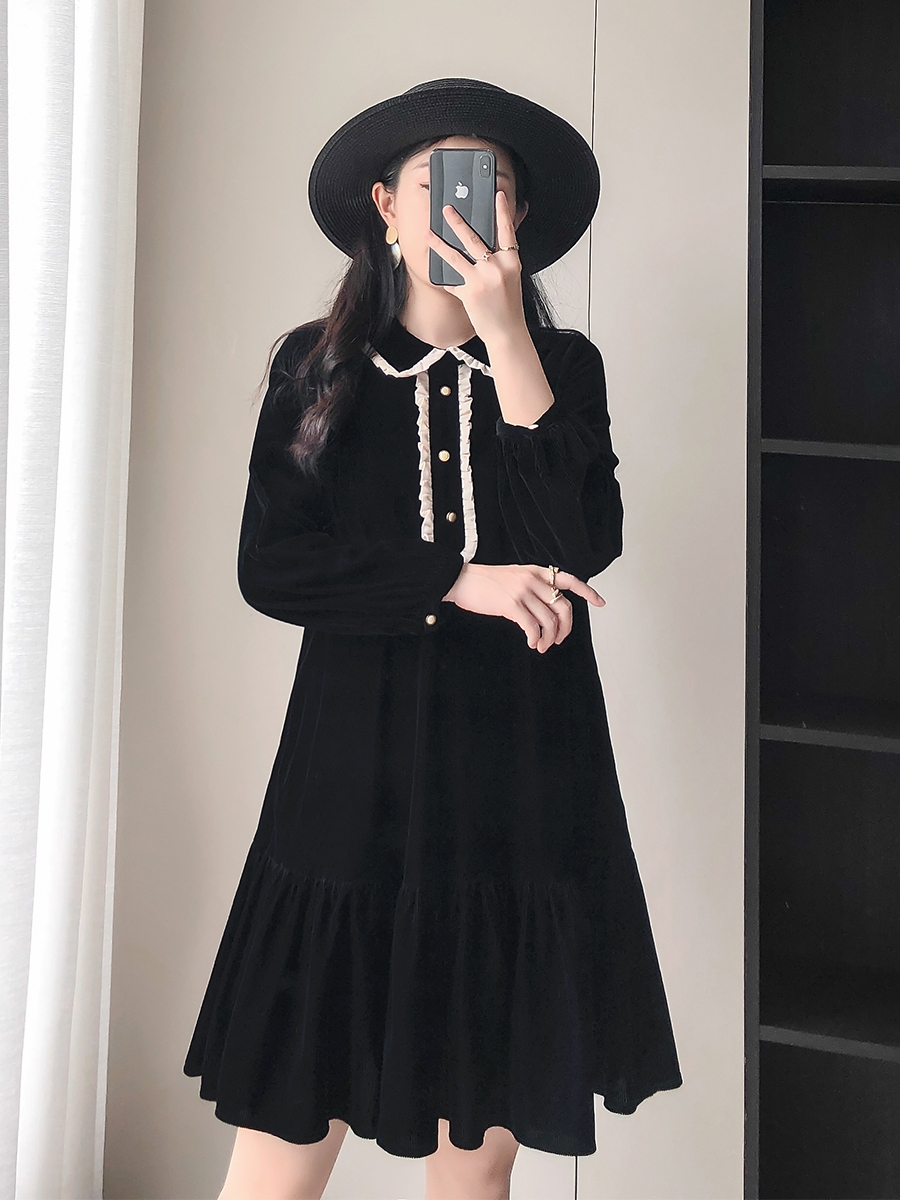 优雅气质型连衣裙,撞色花边娃娃领的设计凸显了一丝甜美,蝴蝶结点缀更是为衣型平添一股秀气,金丝绒的面料质感柔软,很是亲肤,包臀修身设计的裙摆则将身形塑造的更加完美。