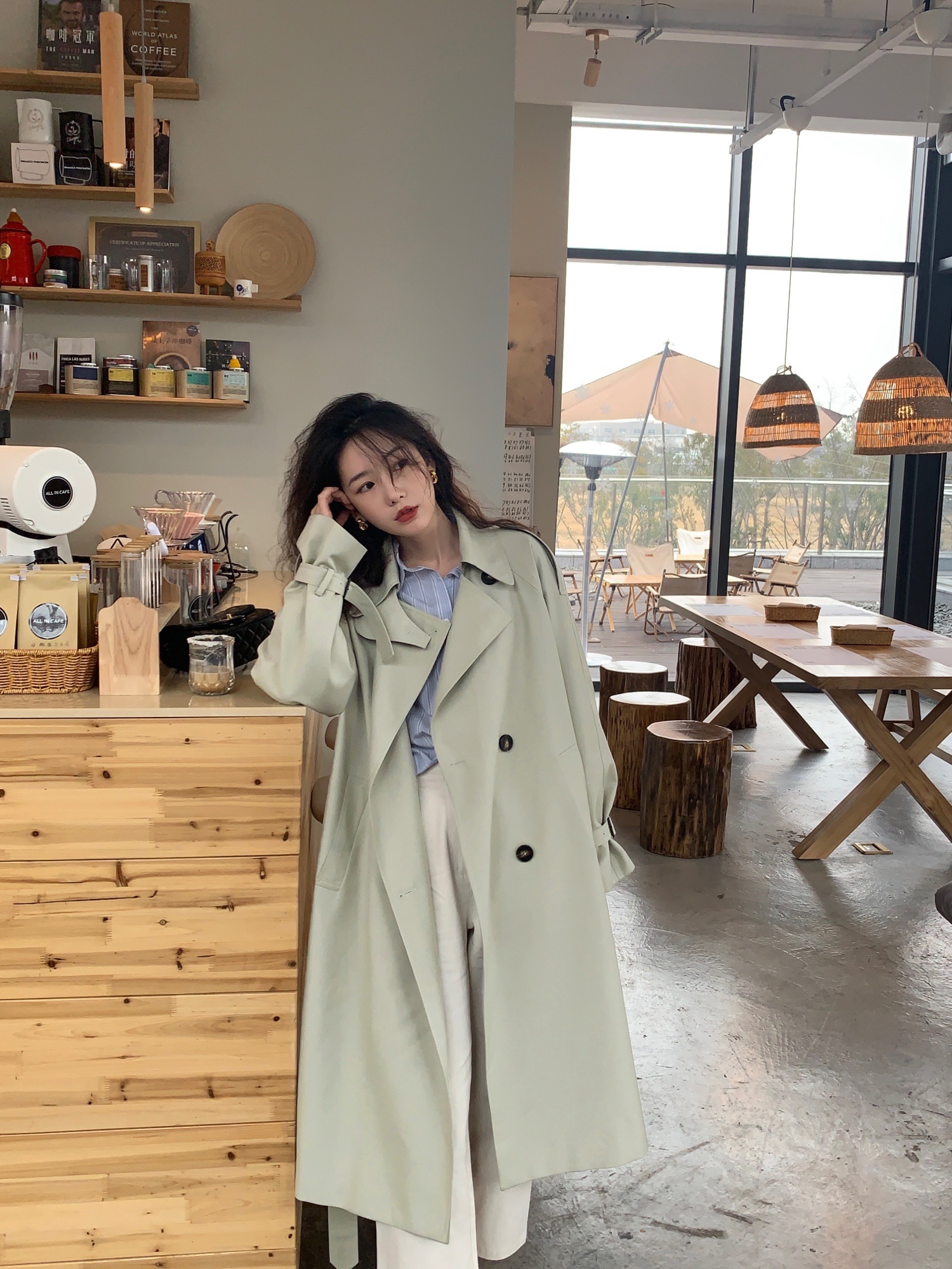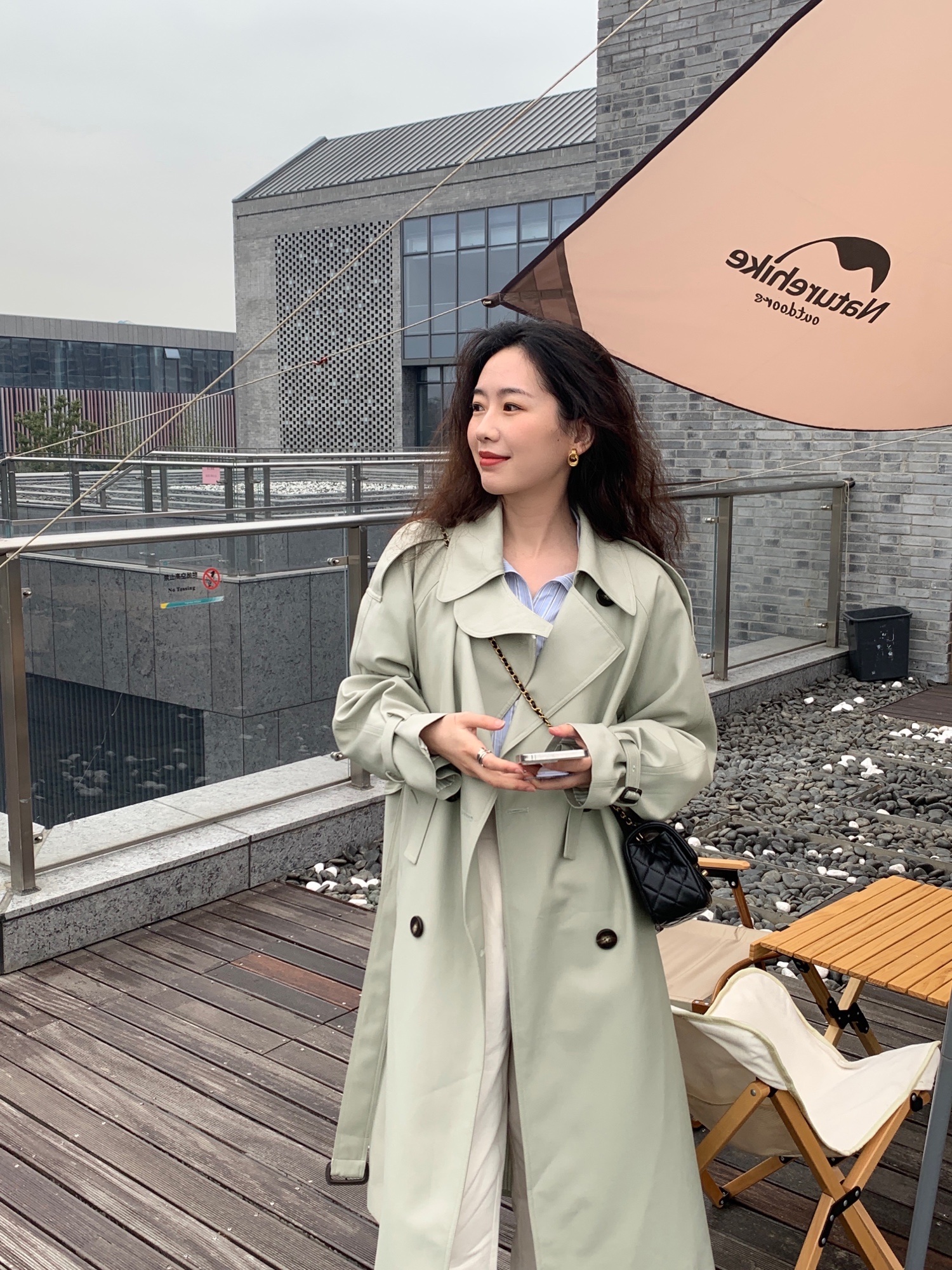 这是一款很有气质的风衣外套,豆沙绿的色调十分的甜美温柔,中长款的版型剪裁经典利落的大翻领设计,显得帅气干练,增添女性率性的气质,袖口的设计,彰显复古英伦风的味道。蝴蝶结本布腰带的设计,勾勒纤细的腰身,显瘦显高。彰显大牌品质感。