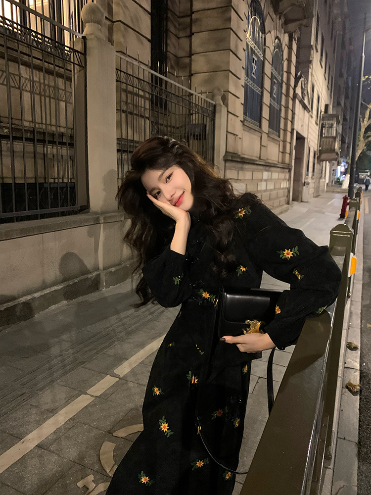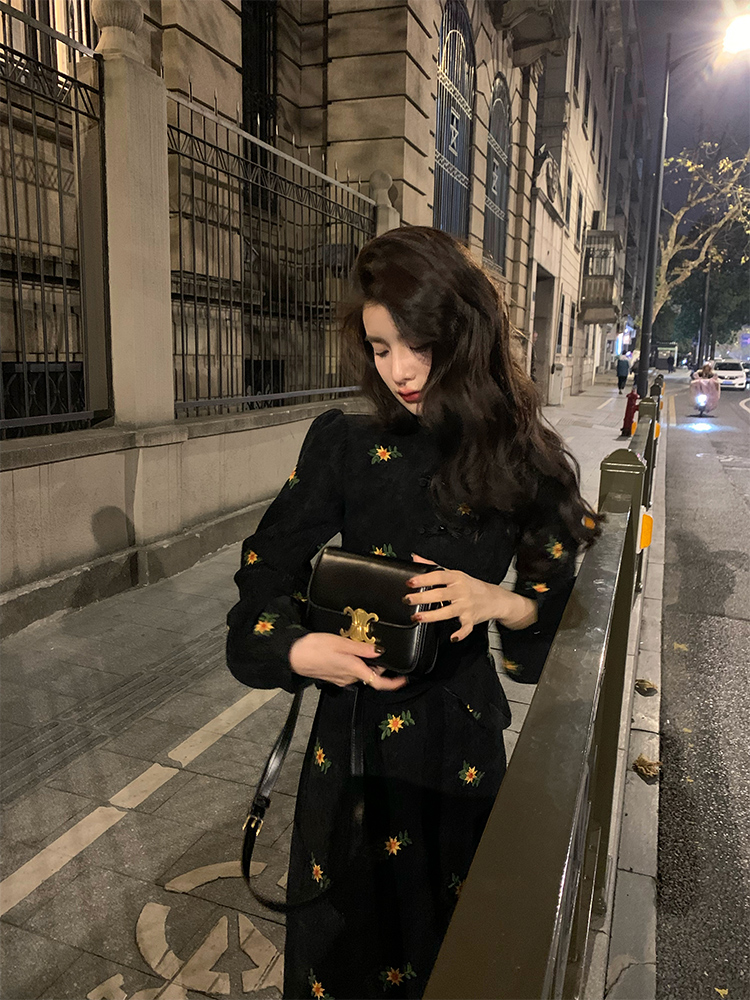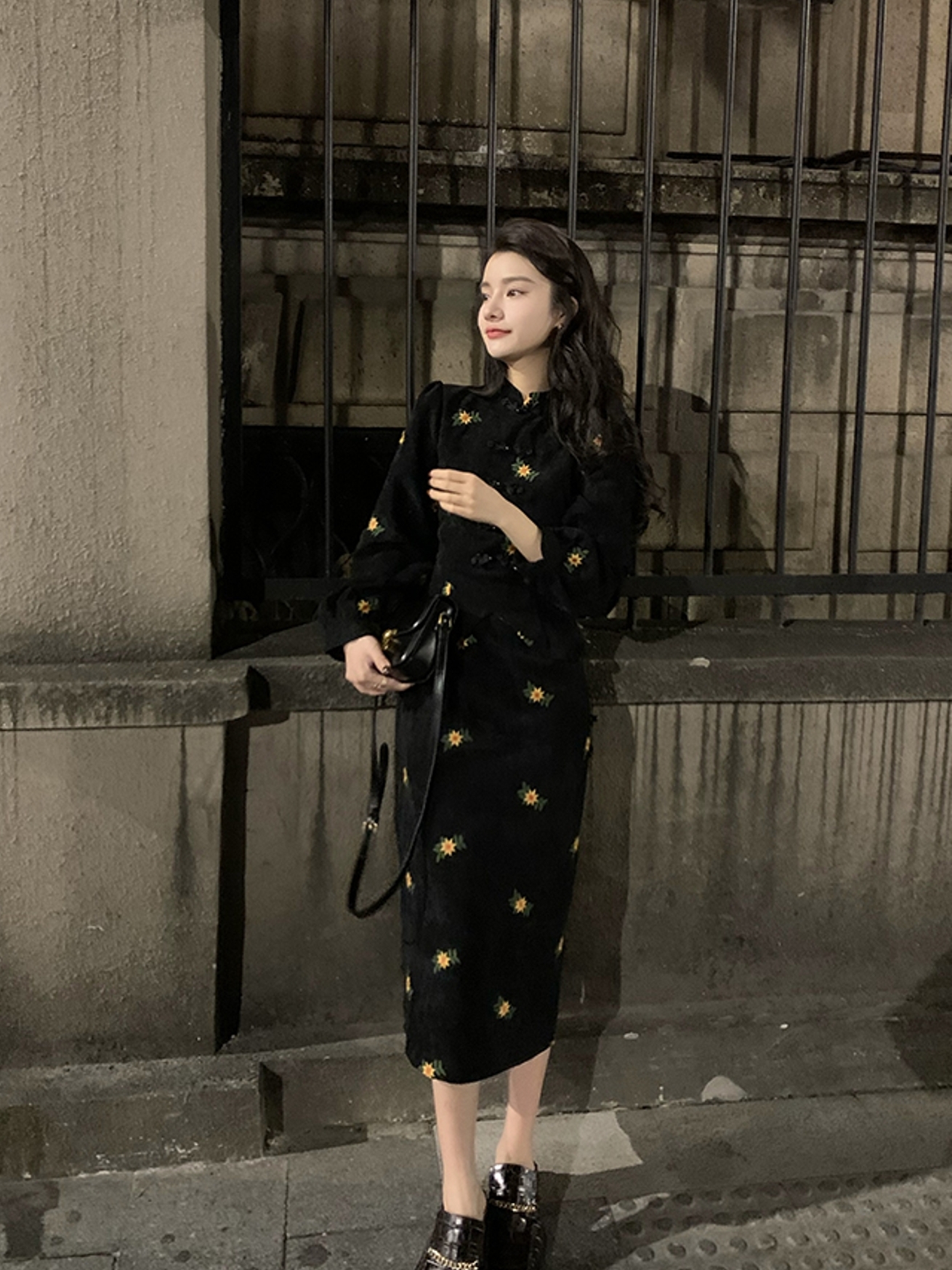 典雅的改良旗袍裙,日常穿着也不突兀,较好的展现女性的温婉。别致的立领结合斜襟,配以珠子点缀,更加的唯美端庄。裙摆添有工笔画印花,视觉上不再单调,显得韵味十足。