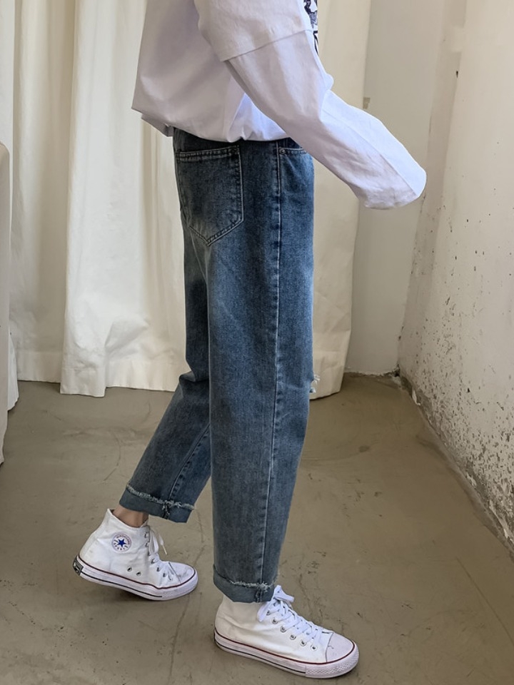 高腰设计,拉长身材比例。高腰牛仔裤,显瘦显腿长。直筒裤型,修饰腿部线条。