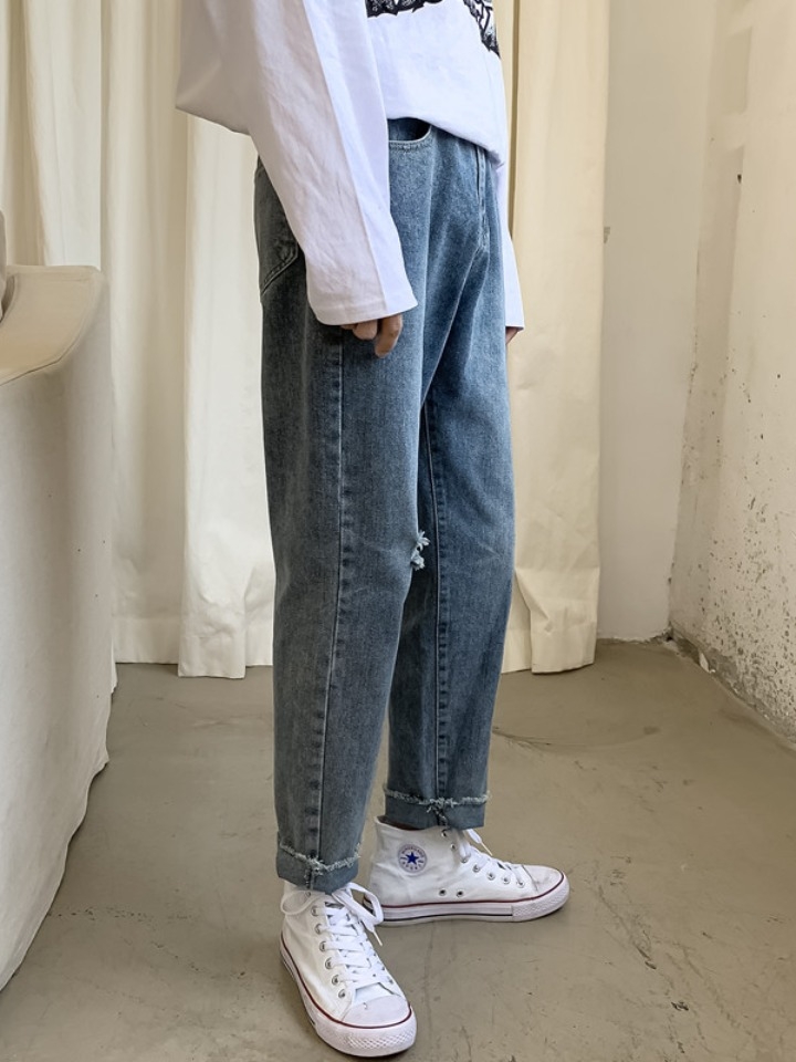 九分的长度剪裁,拉上身线比例,上身更显干练气场,裤腿处破洞元素的点缀,凸显潮酷感,为裤身还平添了几分街头风尚。
